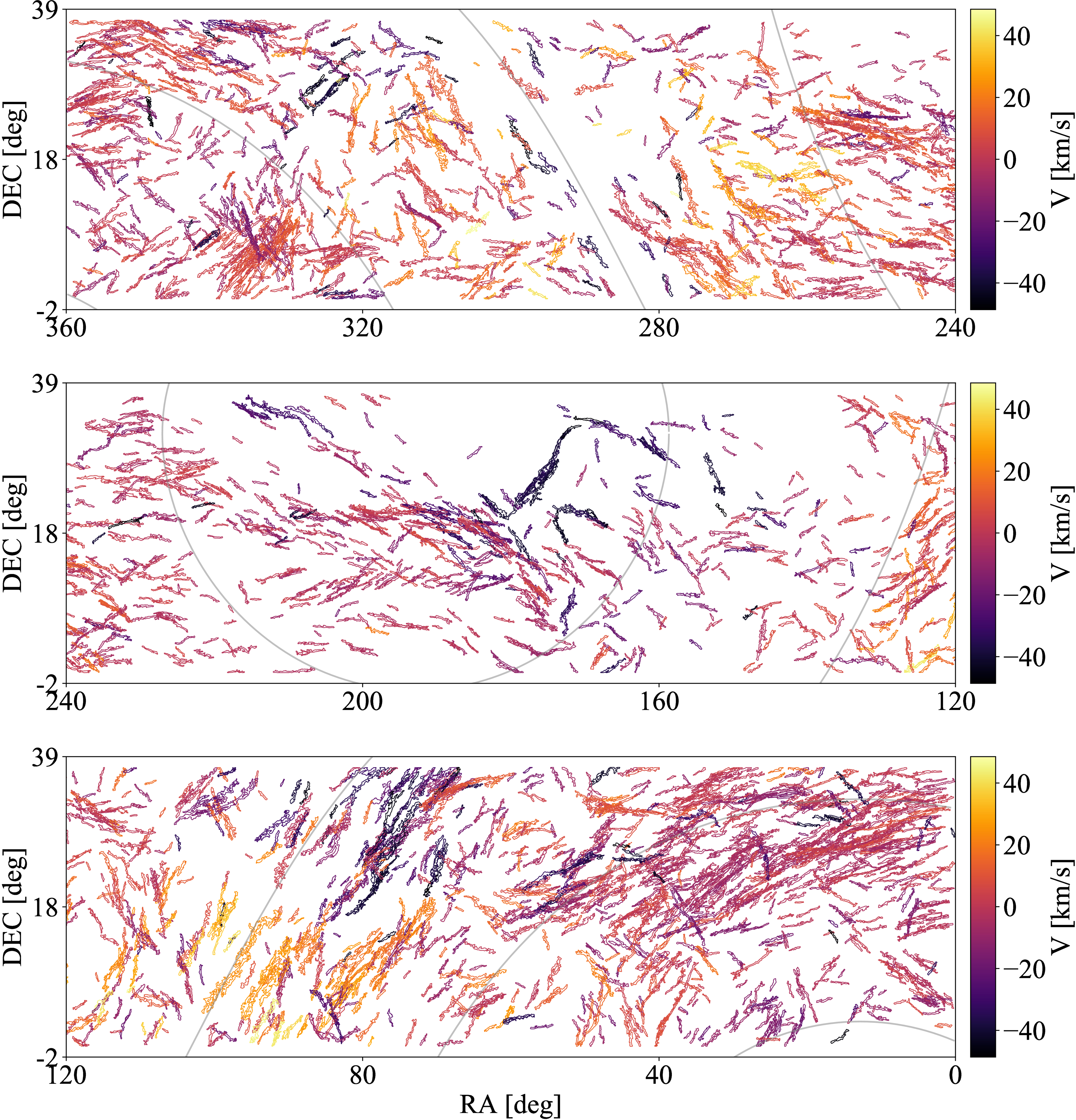 The distribution of the 3D filament catalog on the GALFA-HI survey area with the color showing the average velocity of each filament in the local standard of rest (LSR) frame. The coordinates are noted in R.A. (x-axis) and decl. (y-axis) in degrees and the gray lines on the background represent different Galactic latitudes in 30° increments (top: −30°, 0°, and 30° (inner Galaxy); middle: 60° and 30°; bottom: 0°, −30°, and −60° (outer Galaxy)).