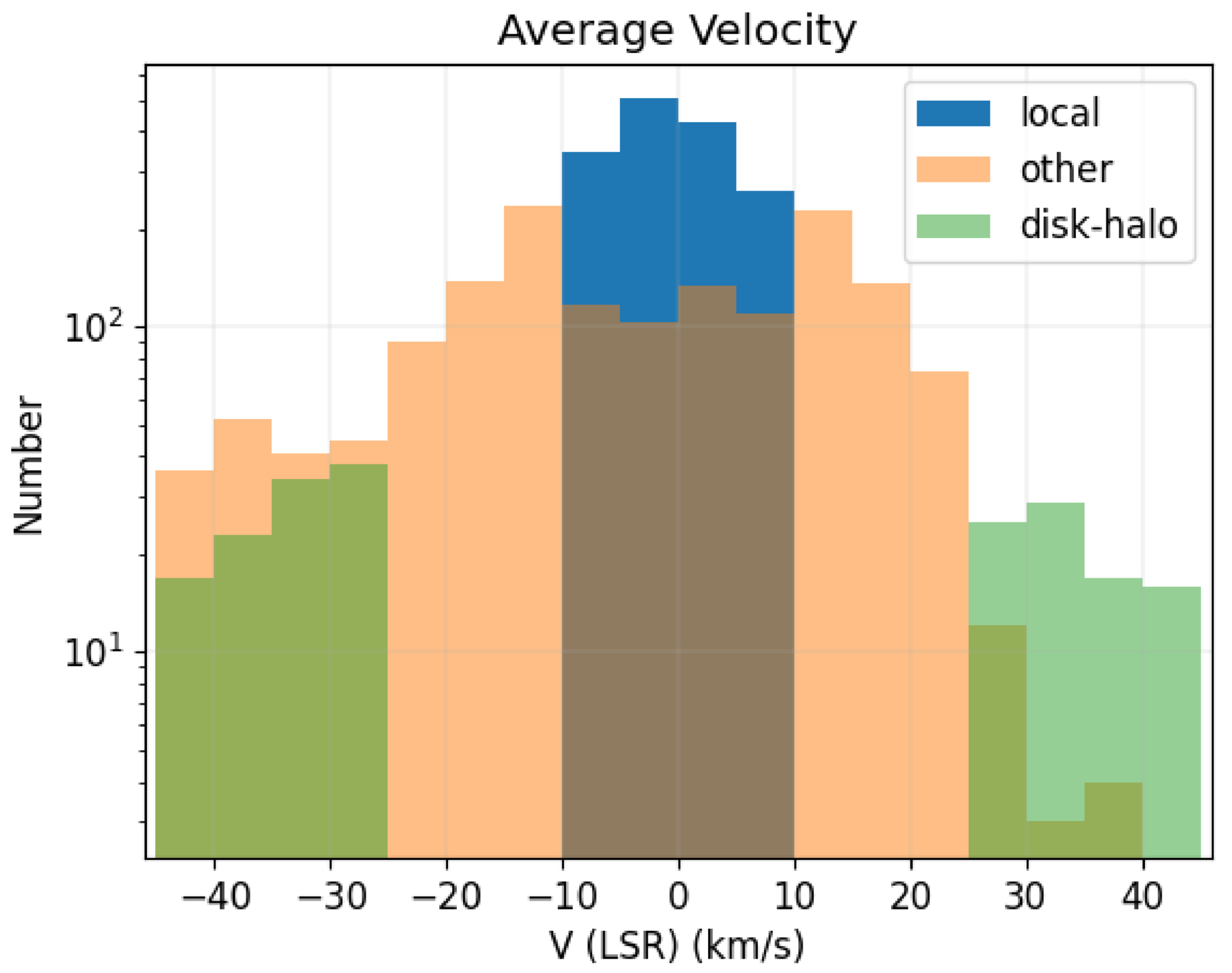 Histogram of the average velocities of the local, disk–halo, and other 3D filaments with the y-axis the number of filaments on a log scale. The “other” population may have local or disk–halo filaments within it, but their locations are less certain.