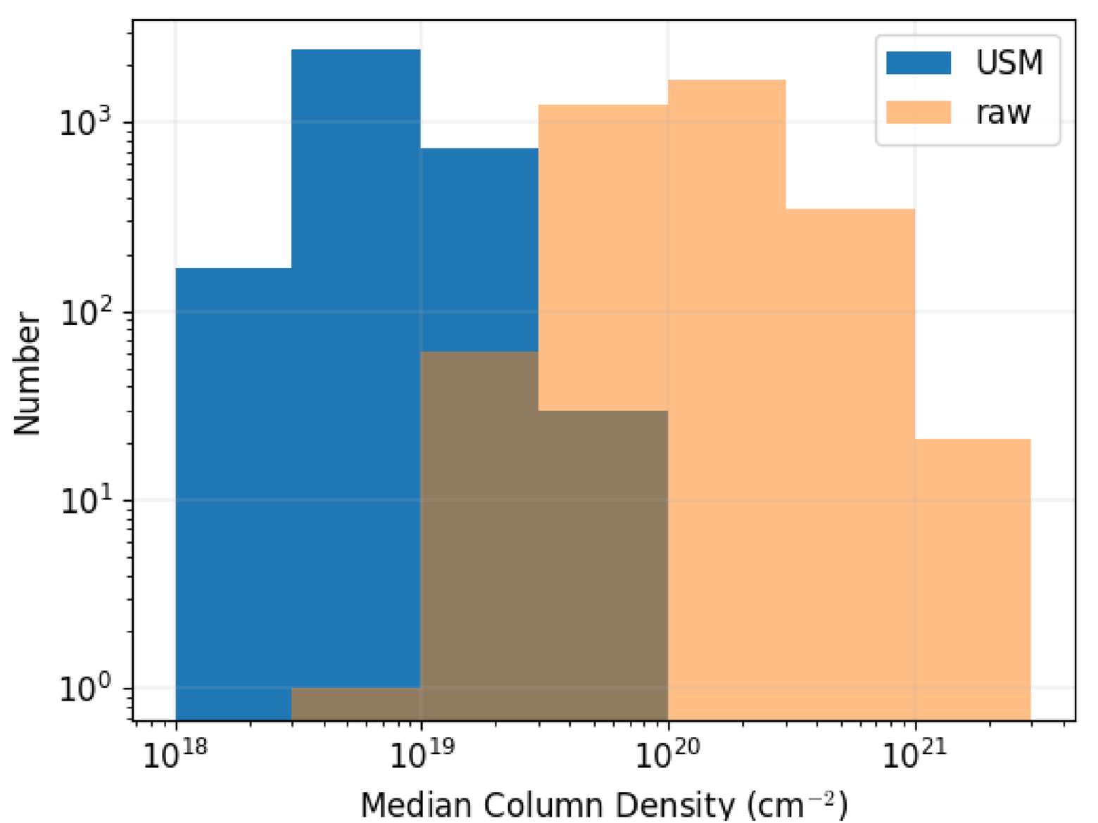 A comparison of the median column density within the filament mask from the USM and raw data for all filaments. There is not a large difference in values between the different filament populations.