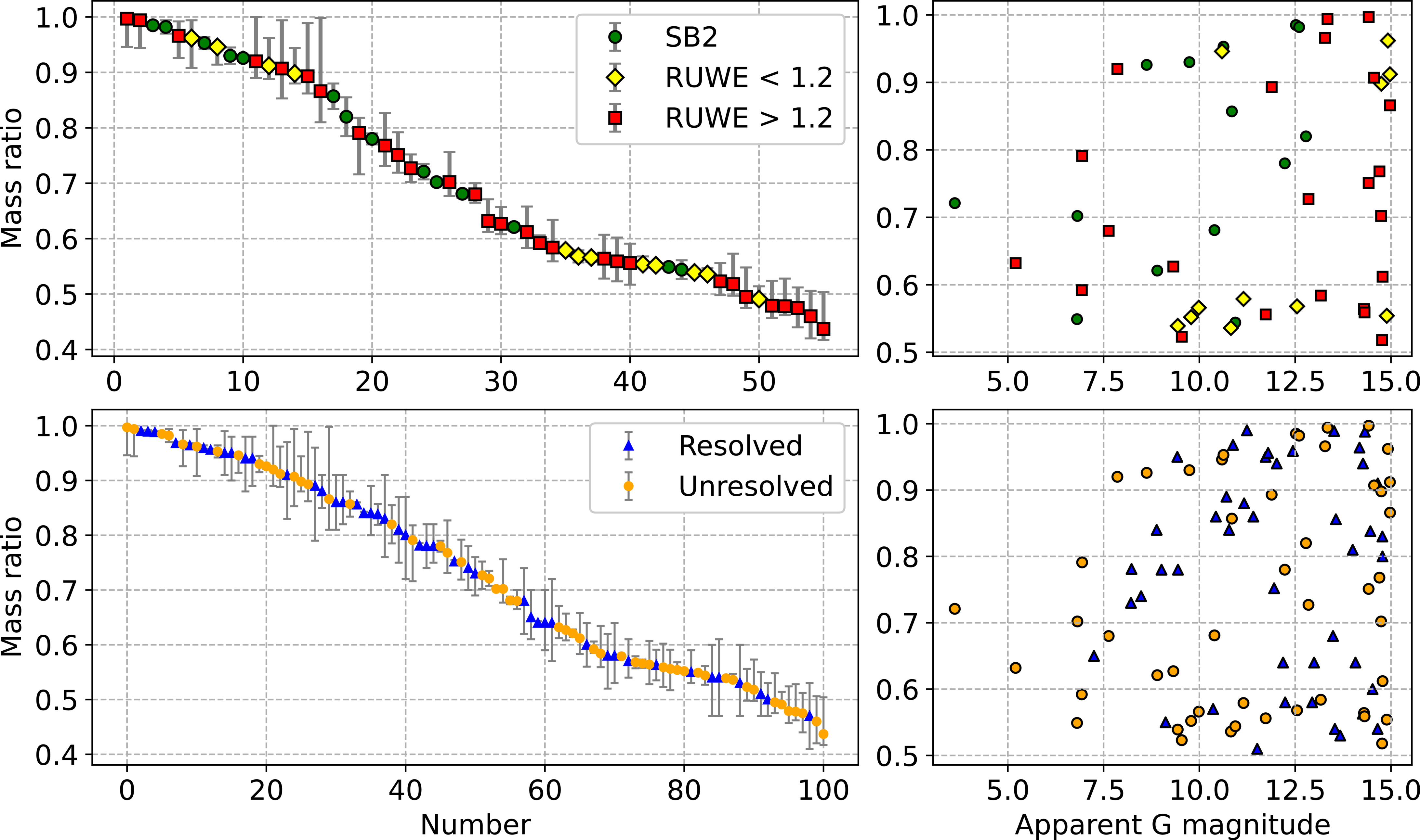 The estimated mass ratios for unresolved binaries (top panel) and the whole binary population (bottom panel).