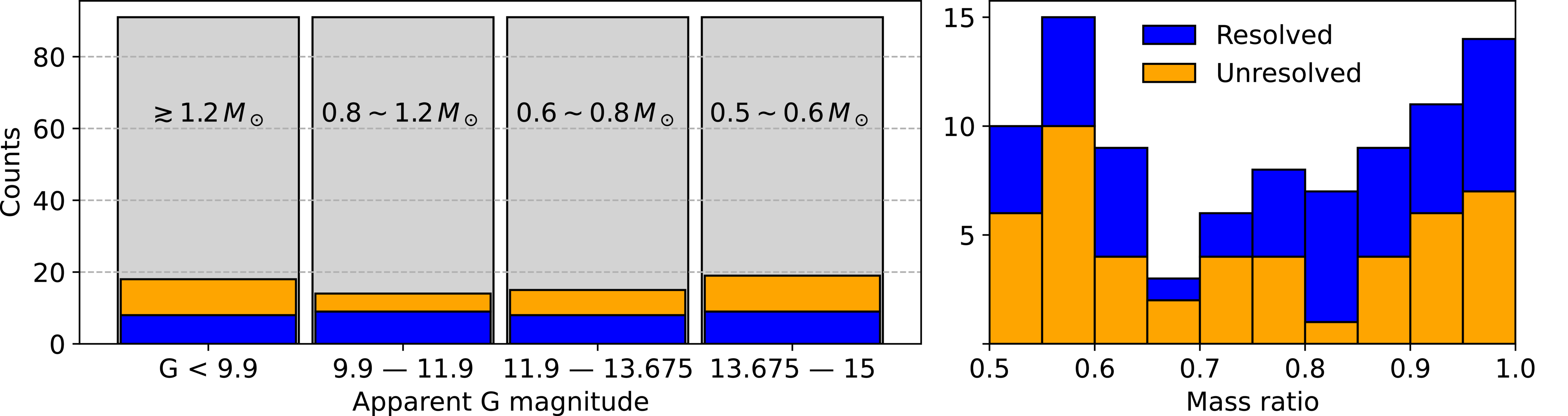 Left: number of resolved and unresolved binaries with q > 0.6 depending on source apparent magnitude. Approximate mass ranges for single stars are shown. Right: mass ratio distribution for binary stars with q > 0.5 in the Pleiades.