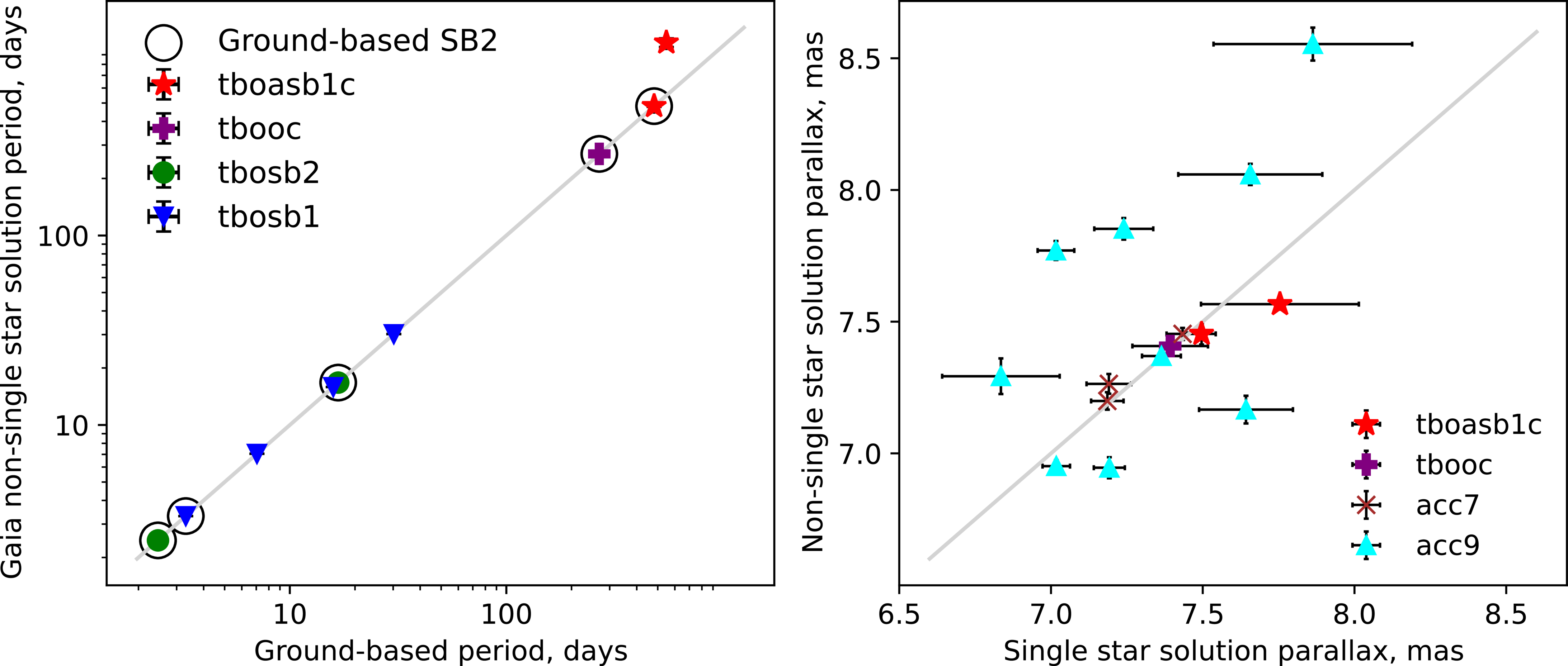 Left: orbital periods according to Gaia DR3 NSS solutions (Section 5) and ground-based estimates from G. Torres et al. (2021). The error bars are smaller than the symbol sizes. Right: parallaxes from the main source catalog and NSS solutions.