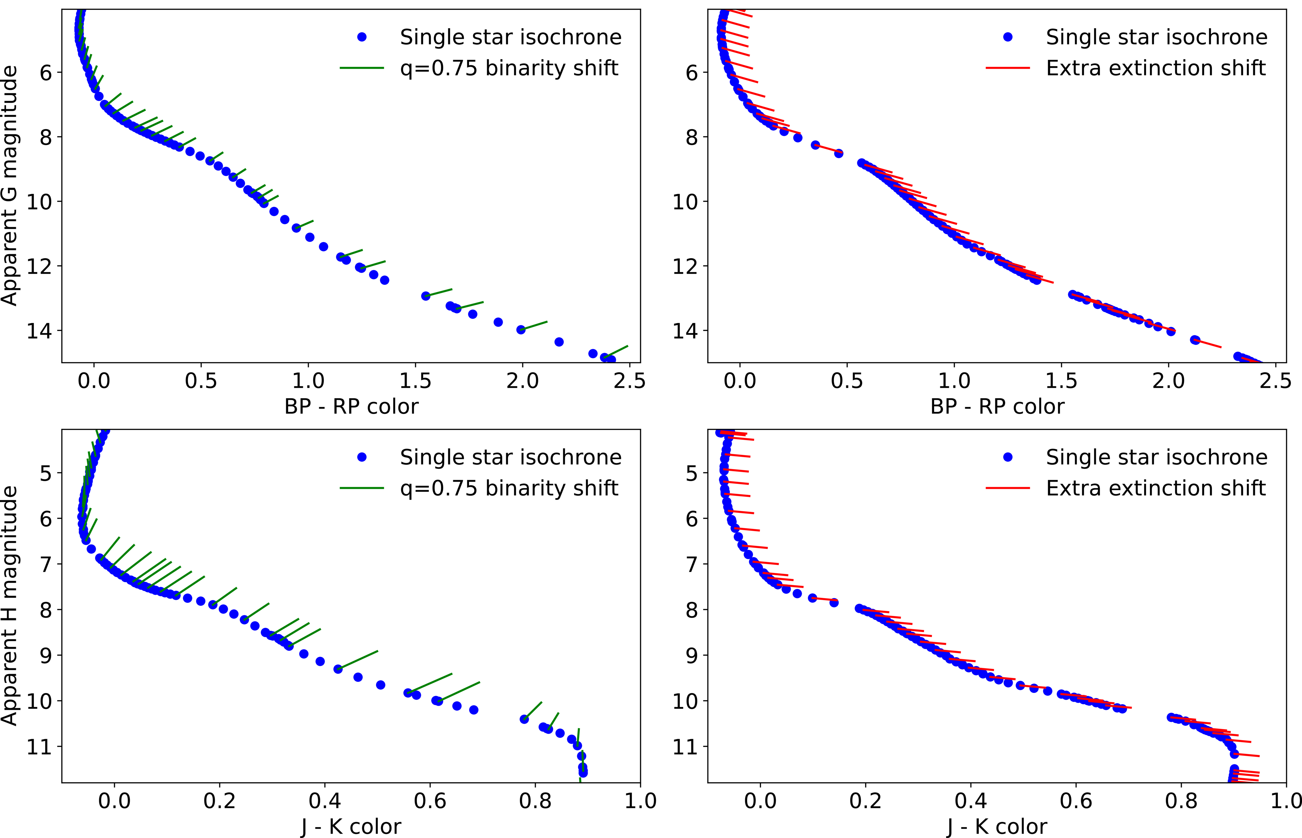 Left: shift of binary systems with q = 0.75 in the CMD relative to the single-star sequence of R. Liu et al. (2025). For twin binaries (q = 1), the color index is unchanged and the combined magnitude becomes brighter by 0.75 mag. Right: impact of enlarged absorption (AV = 0.5 relative to AV = 0.23 mag) on PARSEC 2.0 isochrones with star-by-star derived extinction (J. A. Cardelli et al. 1989; J. E. O’Donnell 1994), calculated via the CMD 3.8 interface (http://stev.oapd.inaf.it/cmd), RV = 3.1.