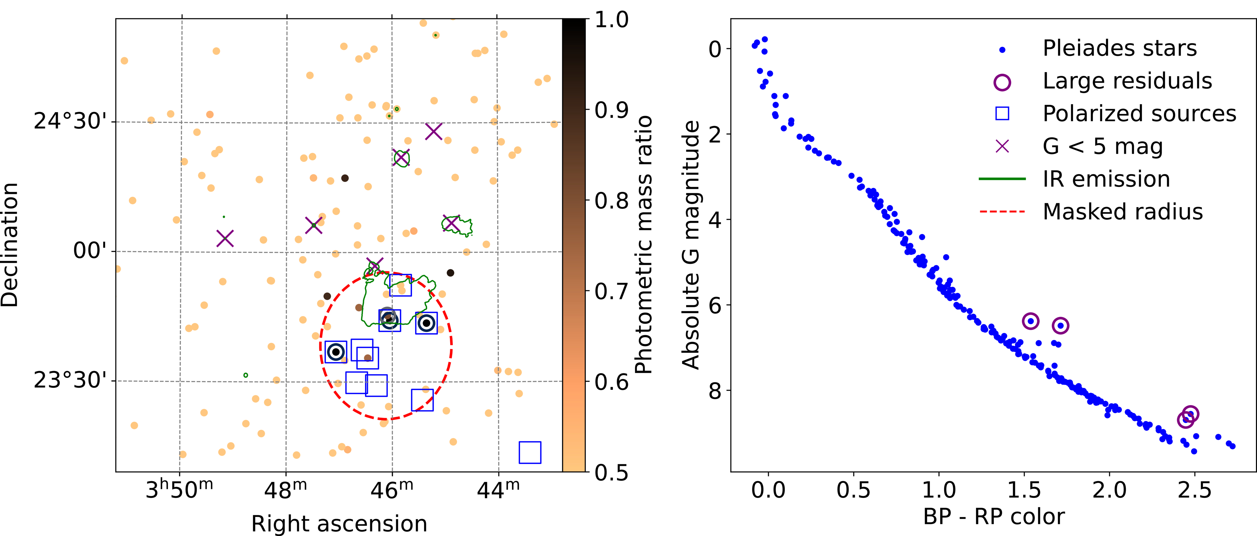 Sky map of Pleiades stars with reliable astrometric and photometric data; the central part of the considered 2° radius is shown. The photometric mass ratio (Section 6.2) is color-coded, where darker shades correspond to larger q. The four entries that are poorly fitted by either single-star or binary-star models (Section 6.4) are encircled; these are shown in the CMD (right panel). The six brightest Pleiades members are marked with purple crosses for guidance. Stars with linear polarization above the 1% threshold according to M. Breger (1986) are enclosed in blue boxes; this includes sources with large RUWE. Nebulosity observed in the WISE W4 passband (22 μm; E. L. Wright et al. 2010) is recovered using the HiPS2FITS service and shown with a green curve. A red circle encompasses the area of unreliable photometric q estimation due to enlarged extinction (Section 6.6).