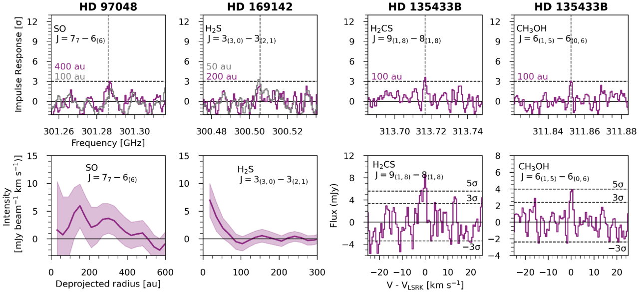 Top: matched-filter responses confirming the tentatively detected molecules in the survey. Each column signifies a different disk as noted in the plot titles, and the radial size of the Keplerian mask(s) is stated in each panel, where purple is a detection and gray a nondetection. Bottom: GoFish radial profiles or disk-integrated fluxes generated over a 0–100 au area.