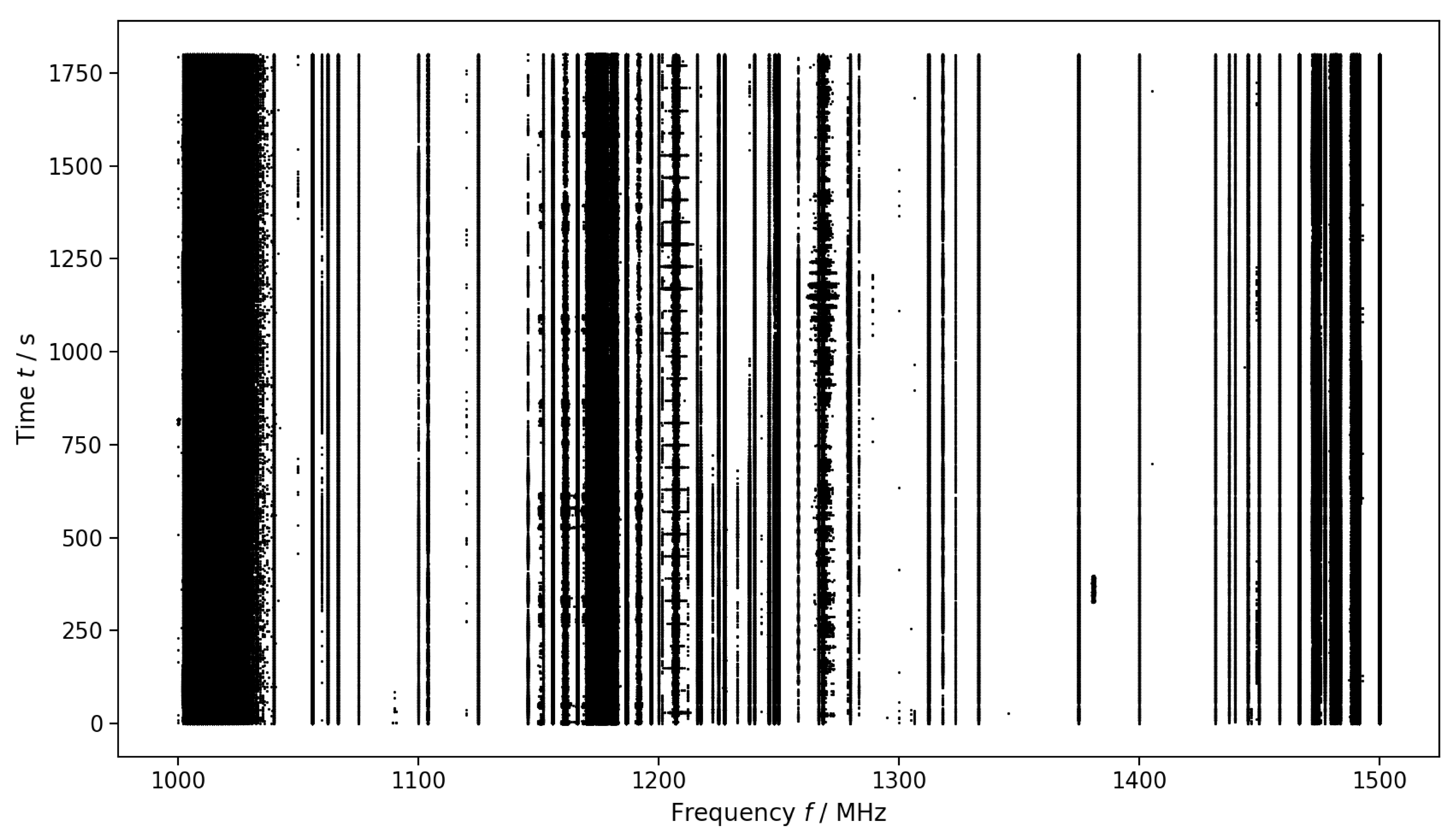 The waterfall (frequency-time) plot of the raw observational data (i.e., hits, marked with black dots) from the first 1800 s of observation. The narrowband RFI is prominent, appearing as vertical lines; some broadband RFI (appearing as horizontal line segments) also exists. This figure is same as the Figure 1 in Y.-C. Wang et al. (2023).