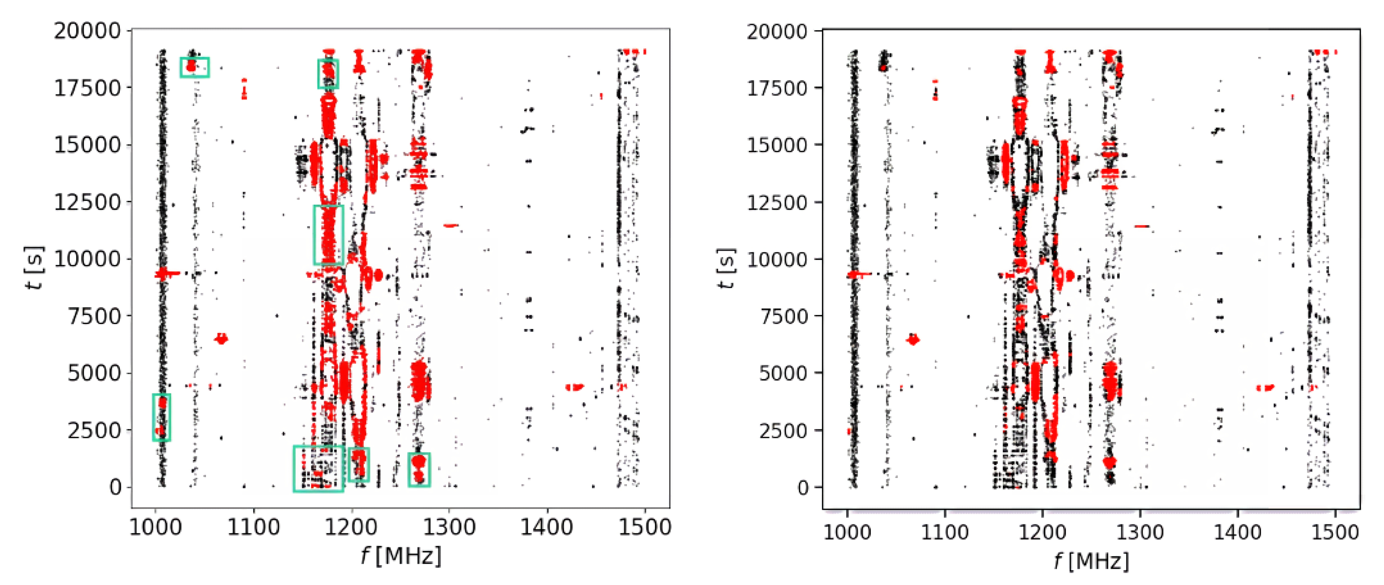 Comparison result between the DBSCAN algorithm and the KNN algorithm for residual RFI mitigation. Data points marked in red represent signals identified and removed as residual RFI, while those in black are retained hits. The left panel shows the waterfall plot after applying the DBSCAN algorithm, demonstrating a residual RFI removal rate of 77.87%. The right panel displays the waterfall plot of the same dataset using the KNN algorithm, achieving a 70.43% removal rate (Y.-C. Wang et al. 2023). Notably, the green boxes in the left panel highlight RFI that DBSCAN effectively mitigation but KNN fails to identify, accounting for approximately 7.44%.
