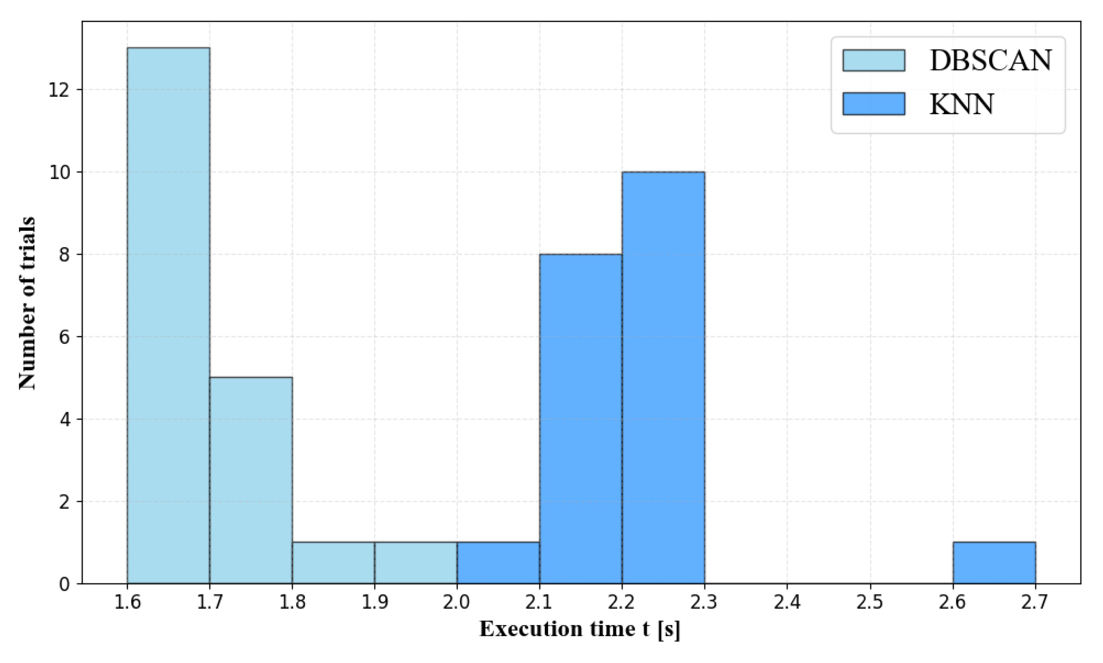 Evaluation of processing speed for residual RFI removal, comparing DBSCAN (light blue) and KNN (dark blue) algorithms. The histogram shows the distribution of execution times across 20 identical runs. DBSCAN demonstrates significantly faster processing, with trials clustering in the 1.6–1.8 s range, while KNN trials predominantly fall in the 2.1–2.3 s range, representing an average speed improvement of approximately 24.85%.