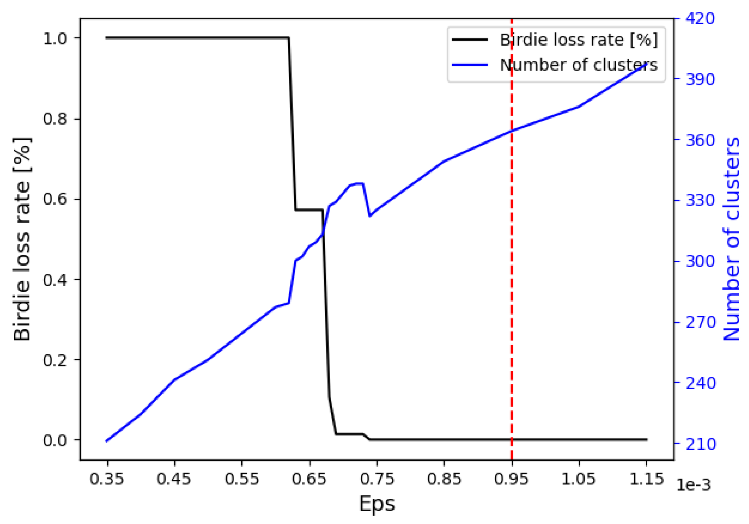 Selection of the DBSCAN Eps parameter for identifying candidate ETI signals (MinPts = 5). The plot shows the birdie loss rate [%] (black line; left y-axis) and the number of clusters (blue line; right y-axis) as a function of Eps. The chosen Eps of 9.5 × 10−4 (indicated by the red dashed vertical line) ensures a 0% Birdie loss rate (guaranteeing all simulated signals are retained) while selecting ETI candidates from hits remaining after RFI removal.