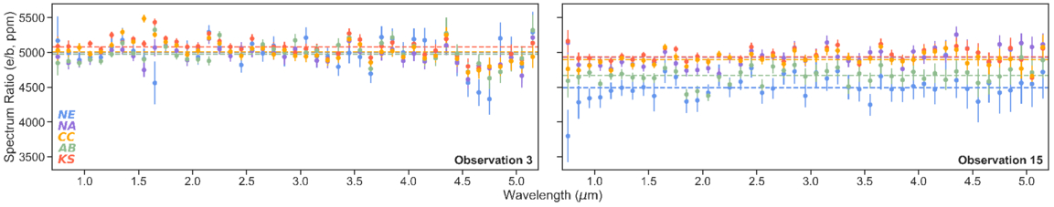 Same as Figure 4, but in absolute spectrum ratio. The dashed lines of each color represent the median spectrum ratio for each reduction. Observation 15 shows an offset in absolute spectrum ratio depth due to the difference of treatment of flares, which can also be seen in the individual TRAPPIST-1 e spectrum in Figure 9.