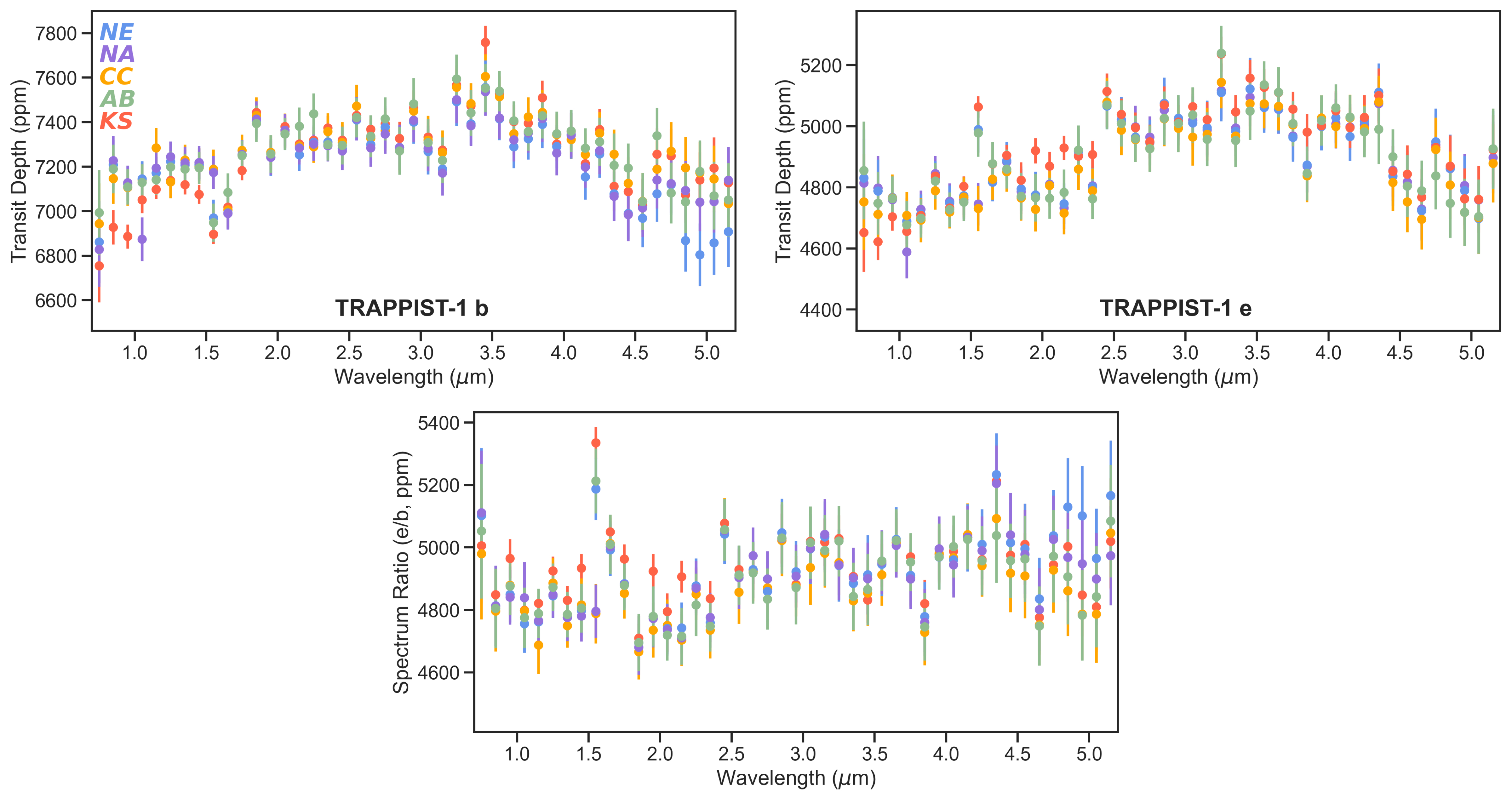 The TRAPPIST-1 b and TRAPPIST-1 e transmission spectra, along with the resulting spectroscopic ratio, for the consistent light-curve fitting test. All reductions show close agreement, suggesting that the differences in spectra seen in Figure 3 are due to choices made during the light-curve fitting process rather than the generation of the light curves from the raw data.