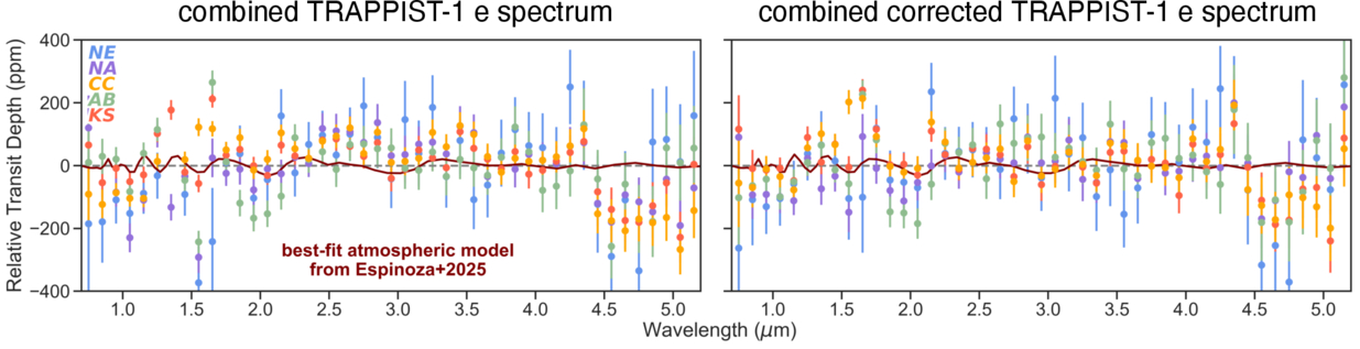 Combined TRAPPIST-1 e spectrum (left) and combined and corrected TRAPPIST-1 e spectrum (right), both from visits 3 and 15. Plotted for comparison is the best-fit atmospheric model from N. Espinoza et al. (2025), for reference. The model lies well within the error bars of our two clean visits.