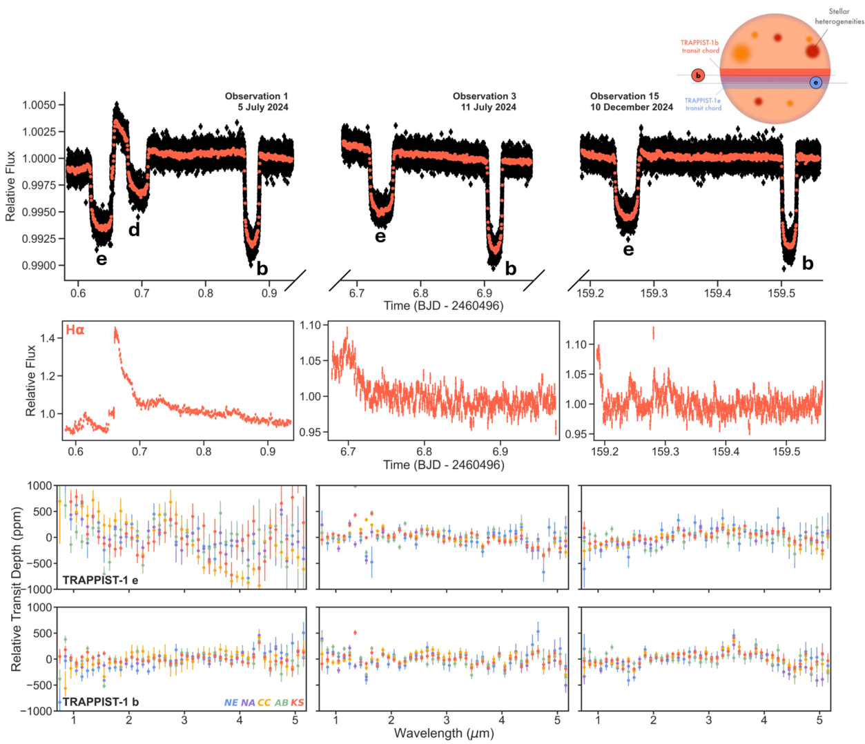 Top: white light curves of observation 1, observation 3, and observation 15 from the N.A. reduction, both at native time resolution in black and binned to 25× in red for visibility. All transits are labeled by planet. Observation 1 also has a large flare that occurs right before the egress of planet e. Shown in the upper right is a schematic of our proposed setup, with the true overlapping planetary transit chords taken from E. Agol et al. (2021). Middle: Hα light curve from the N.A. reduction. Peaks in Hα correspond to flaring events, many of which are not visible in the white light curve, at least without hints to their location from the Hα signature. Note that the light curves are binned in time to 50× (to approximately 70 s bins) relative to that shown in the white light curve for visibility in the low signal single wavelengths shown. Bottom: transmission spectrum of TRAPPIST-1 e (top) and TRAPPIST-1 b (bottom) for observation 1, observation 3, and observation 15 from left to right.
