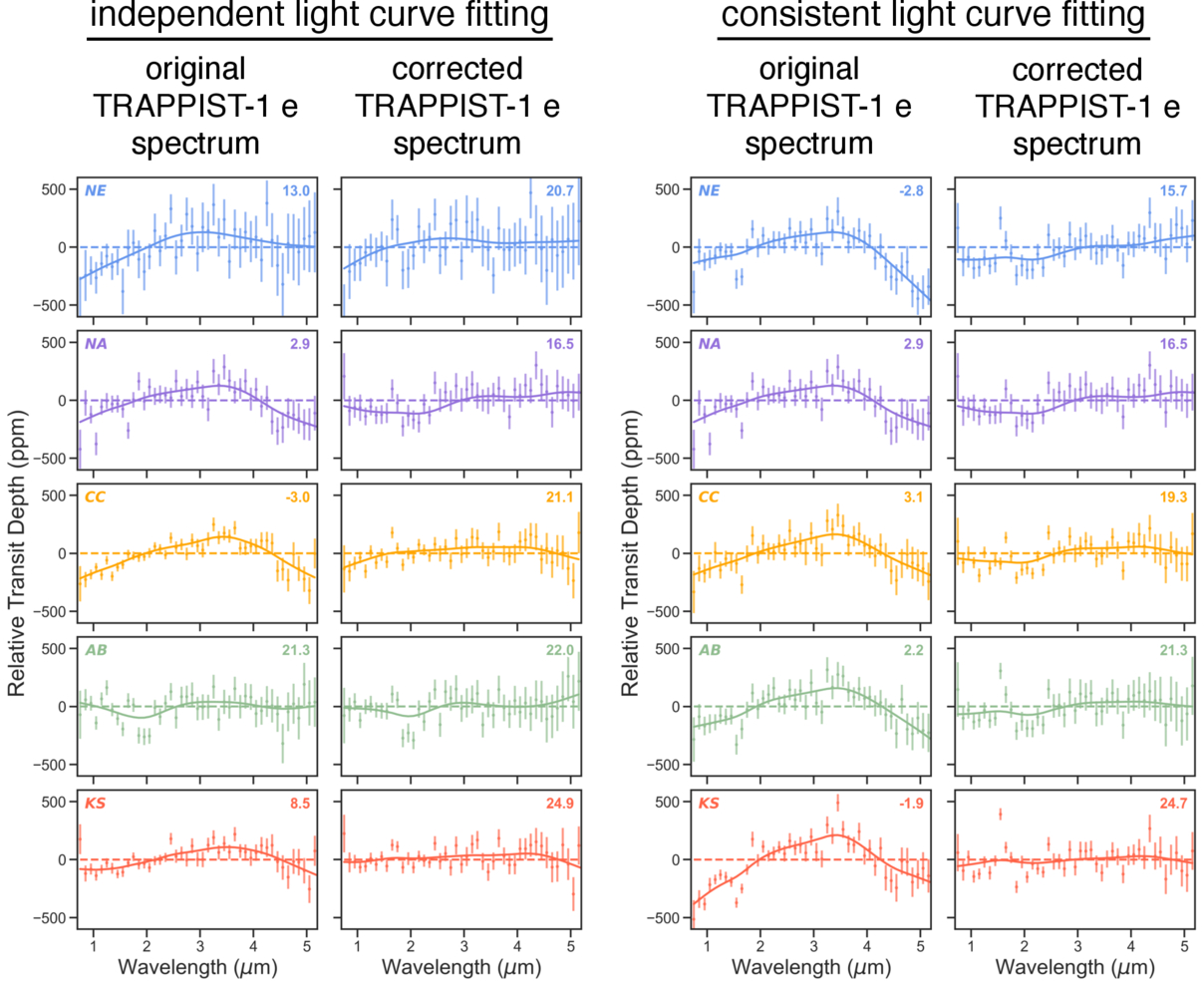 The original TRAPPIST-1 e spectrum and the corrected TRAPPIST-1 e spectrum for observation 15, where “corrected” means dividing by the TRAPPIST-1 b spectrum and then multiplying by the median transit depth of the TRAPPIST-1 b spectrum to return them to the same scale. Plotted on top are GP and flat line fits to the data. The number in the top right corner is the Δln Z between the flat line and GP models, such that a negative number prefers a GP and a positive number prefers a flat line. On the left are the results from the independent light-curve fitting described in Section 3.1, and on the right are the results from the consistent light-curve fitting test carried out using the setup from the N.A. reduction. For all reductions and both cases, the corrected spectrum more strongly prefers a flat line over the GP model than the original spectrum, which suggests that the corrected spectra are more consistent with a flat line and are corrected, at least in part, for the stellar contamination signal. The shape of the GP model for the corrected spectra differs somewhat for each reduction in the independent light-curve fitting case, but the shape looks very similar across the reductions for the consistent light-curve fitting case. For all cases, a flat line is always more strongly preferred after the spectroscopic ratio is taken.