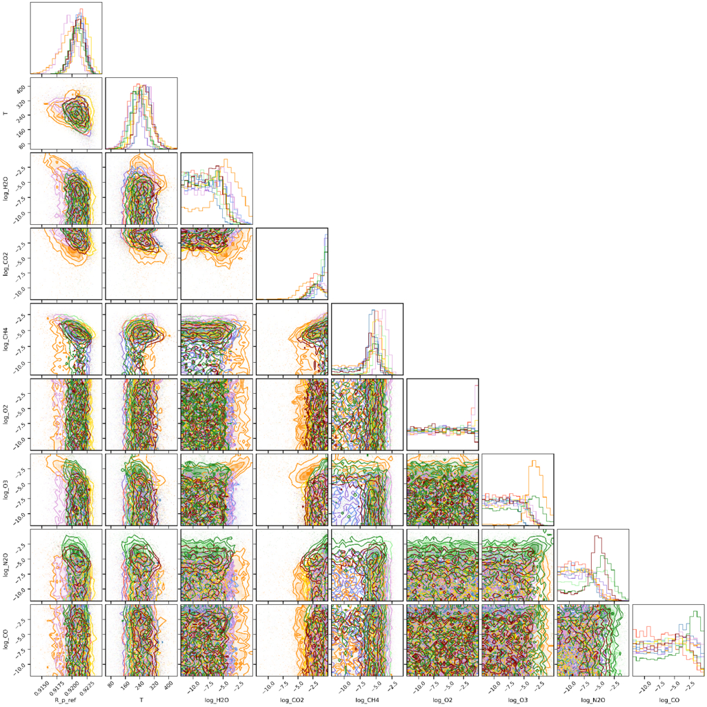 The posterior distributions associated with the 15 close transit retrievals for each of the 10 noise instances shown in Figure 1. We confidently detect CO2 in all noise instances, and sometimes are able to detect CH4 as well. None of the other species are constrained to greater than upper limits.