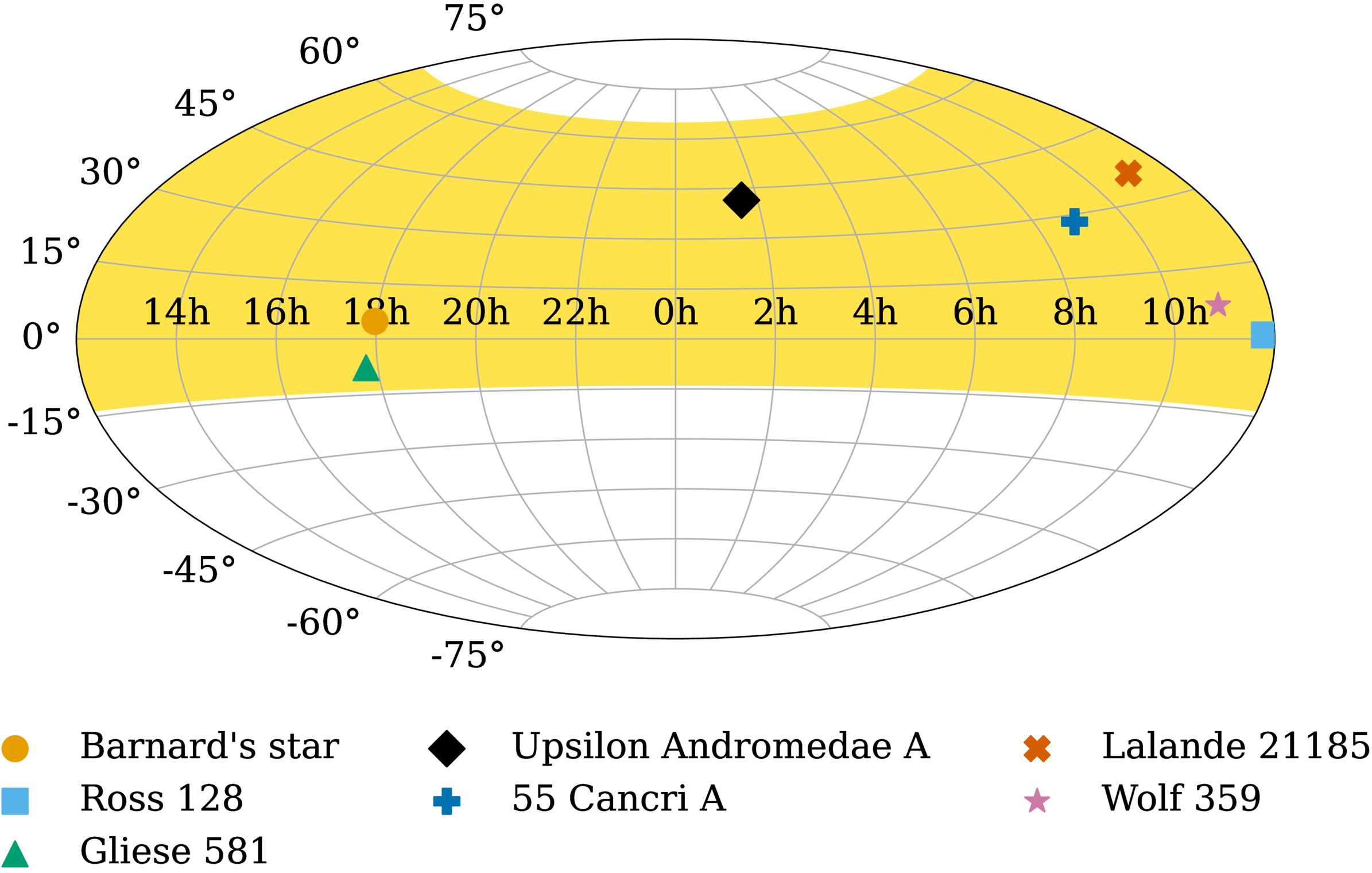 Observation targets in equatorial coordinates. The observable sky coverage of FAST is shaded yellow.