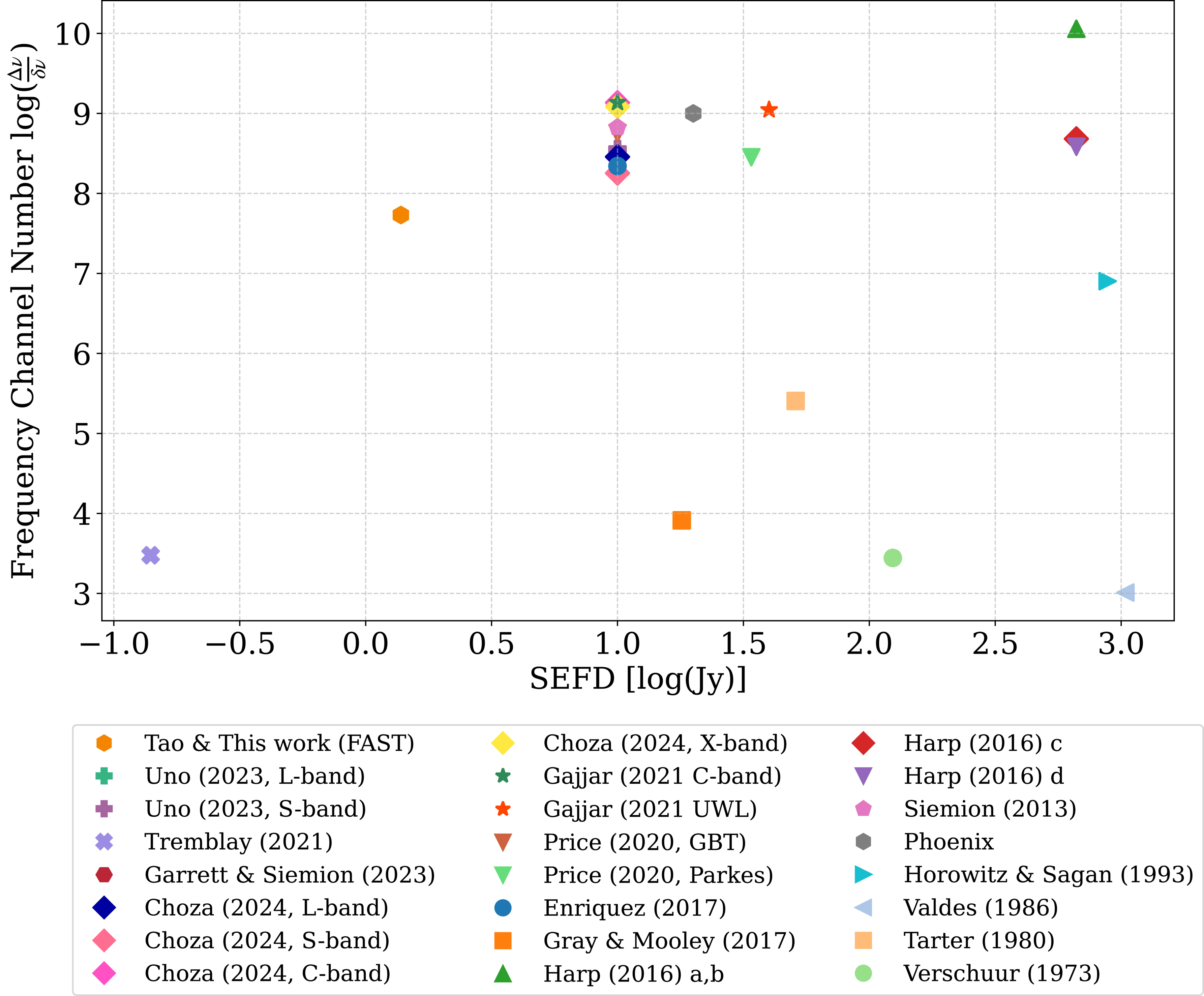 SEFD versus frequency channel number (Δν/δν) for this work and some previous SETI projects. The values of the plotted points for past surveys are the same as the references in Figure 11.
