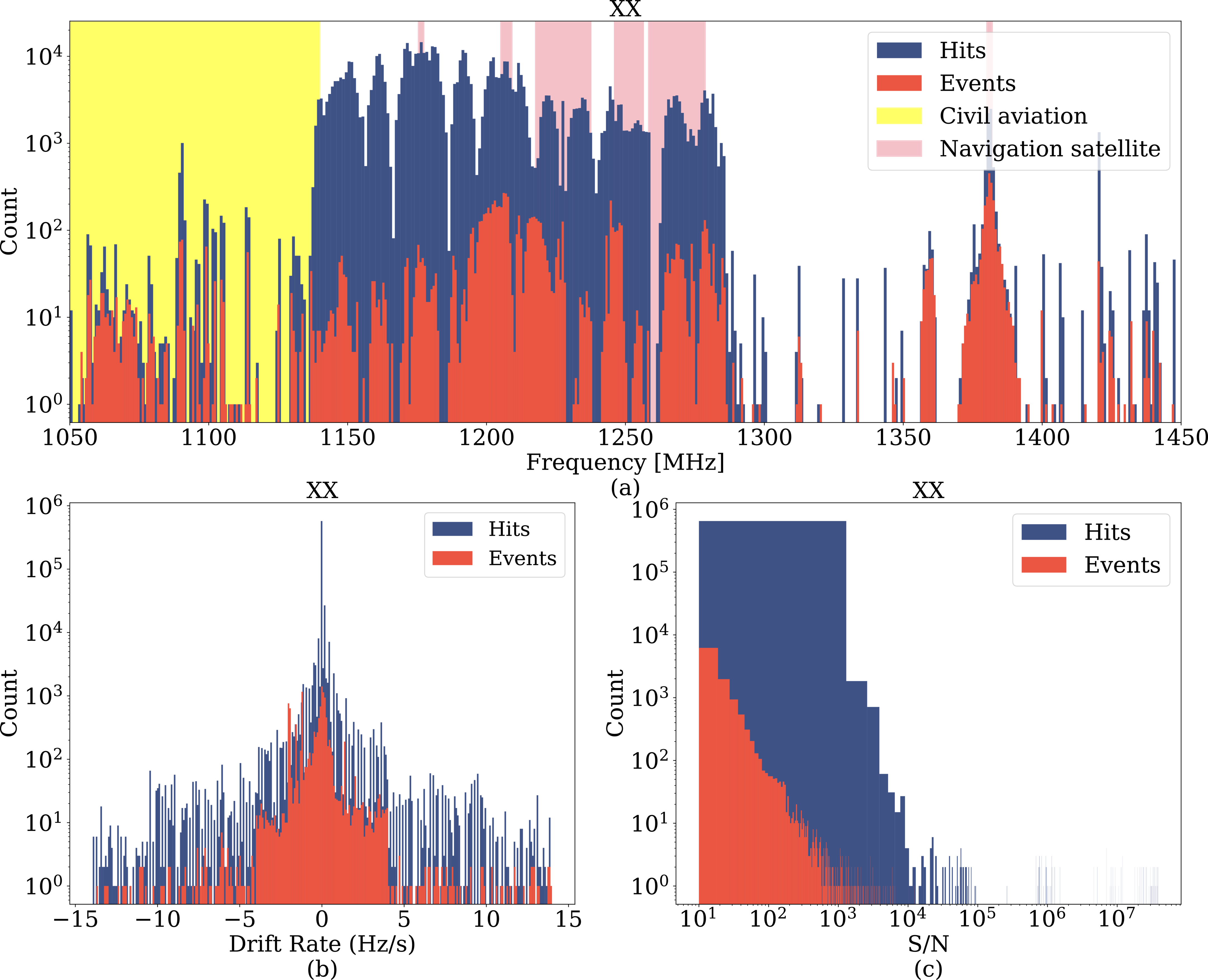 Histograms of the distributions of frequency, drift rate, and signal-to-noise ratio in the XX channel. The frequency bands of some known interference sources are displayed on the frequency panel.