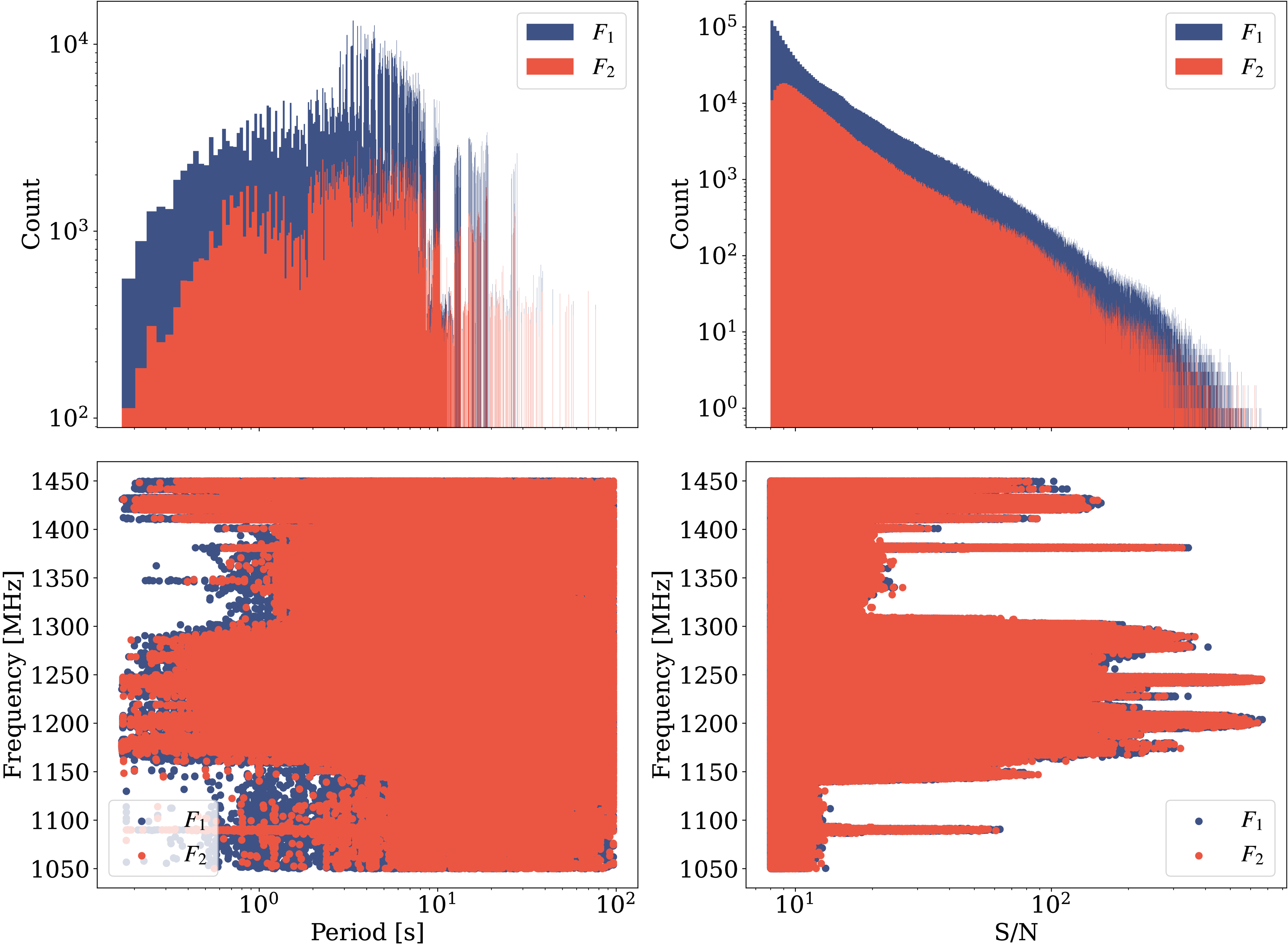 Statistical distribution of F1 (blue) and F2 (red) in the search. Top left: histogram of the candidate periods. Top right: histogram of the signal-to-noise ratio of the candidates. Bottom left: scatter of candidates in the ν–P plane. Bottom right: scatter of candidates in the ν–S/N plane.