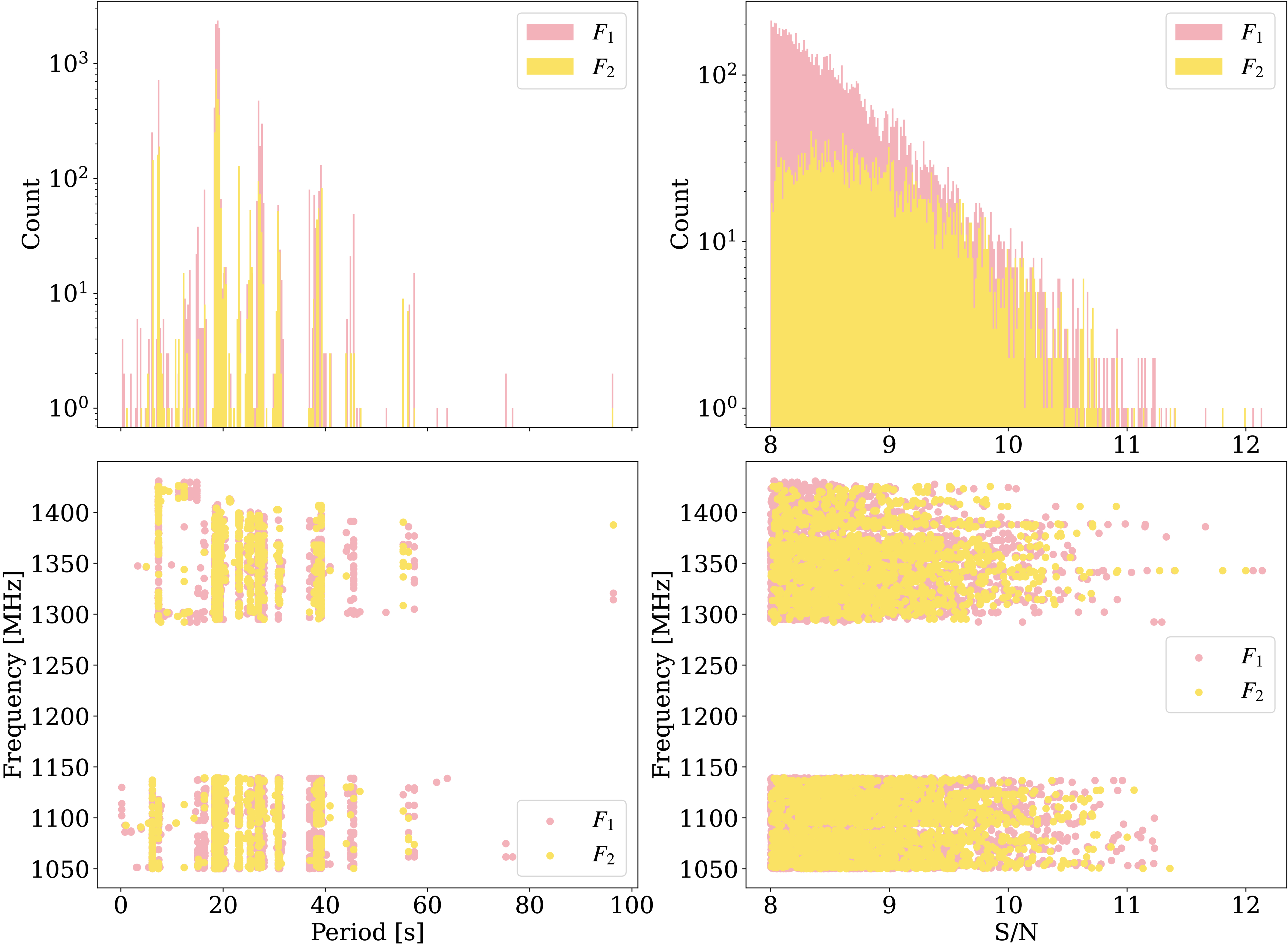 Statistical distribution of F1 (pink) and F2 (yellow) in the search similar to Figure 7 but after filtering.