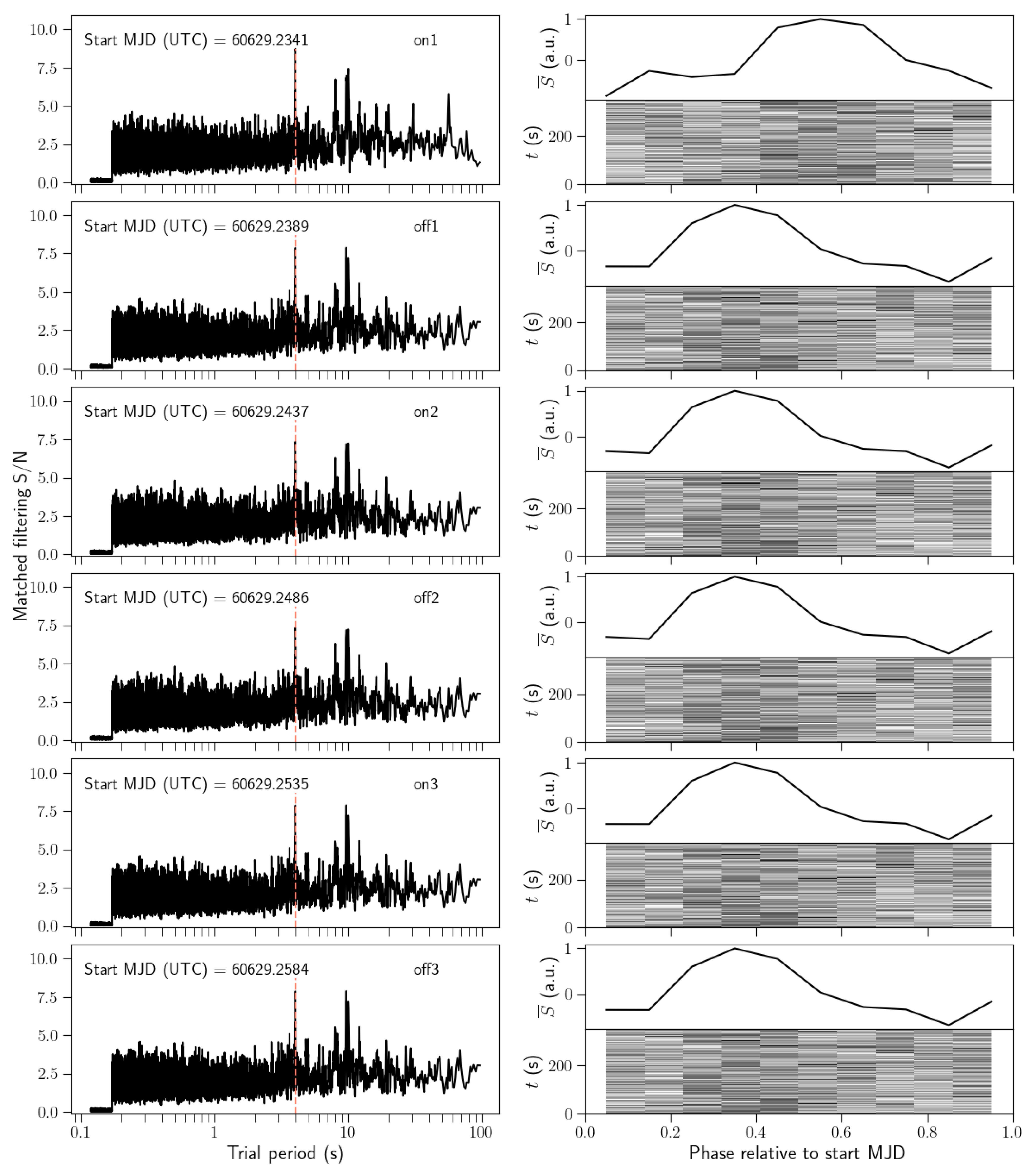 Plot for the candidate in the 1089.111328 MHz channel during the observation of Barnard’s star. Left panels are the periodograms generated from the time series. Right panels show the phase–time diagrams (bottom subplots) and folded profiles (top subplots) of candidates at P = 4.00106 s. The peak of the periodogram and the folded profile are detected in the first on-source scan.