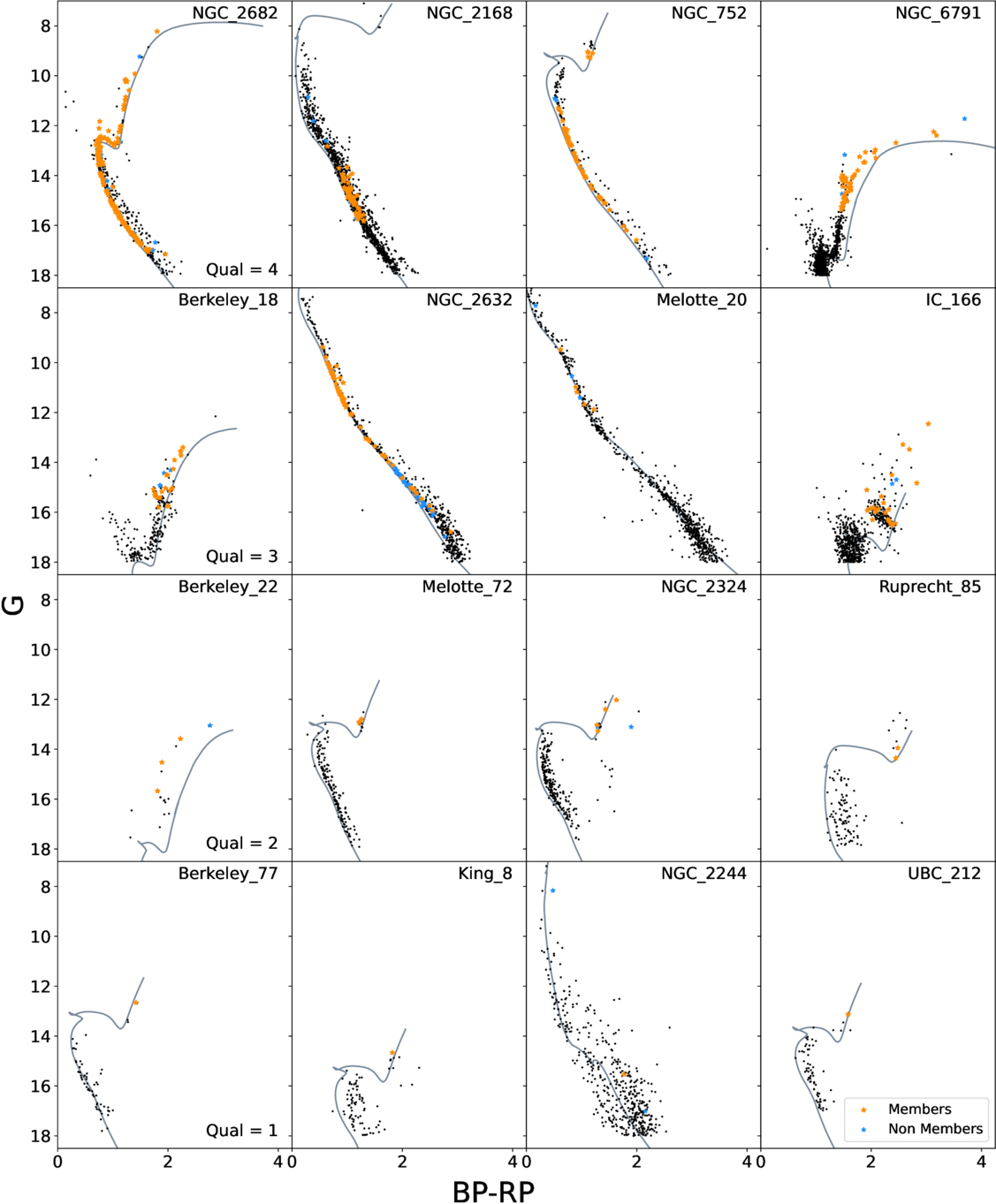 A selection of example ESA Gaia CMDs (BP − RP, G) from each of the four quality categories. APOGEE/MWM calibration clusters (Qual = 4) are shown in the first row, high-quality clusters (Qual = 3) with more than five stars in the second, high-quality clusters (Qual = 2) with 2–4 stars in the third, and good clusters (Qual = 1) with only 1 star in the bottom row. The T. Cantat-Gaudin et al. (2020) ESA Gaia-identified, proper motion-selected member stars are shown as black points, OCCAM pipeline-identified MWM/APOGEE members from DR19, adding RV and [Fe/H] selection, are shown as orange stars. The blue stars are proper motion-selected member stars that the OCCAM pipeline has rejected as RV and/or [Fe/H] members. A PARSEC isochrone generated with the mean cluster [Fe/H] from OCCAM, and the distance, reddening, and age from T. Cantat-Gaudin et al. (2020) is plotted in gray. (Note: no effort has been made to adjust/refit the isochrone fit in this work.)