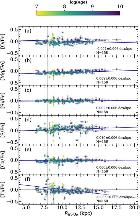 The [X/Fe] vs. RGuide trend for the α-elements (O, Mg, Si, S, Ca, Ti). The color bar indicates the age of the cluster in log(Age) from T. Cantat-Gaudin et al. (2020). Clusters with a 1σ scatter greater than 0.2 dex for a specific element were not used to determine the fit (solid blue line) and are not plotted. The derived gradient and number of clusters (N) are shown in each panel.