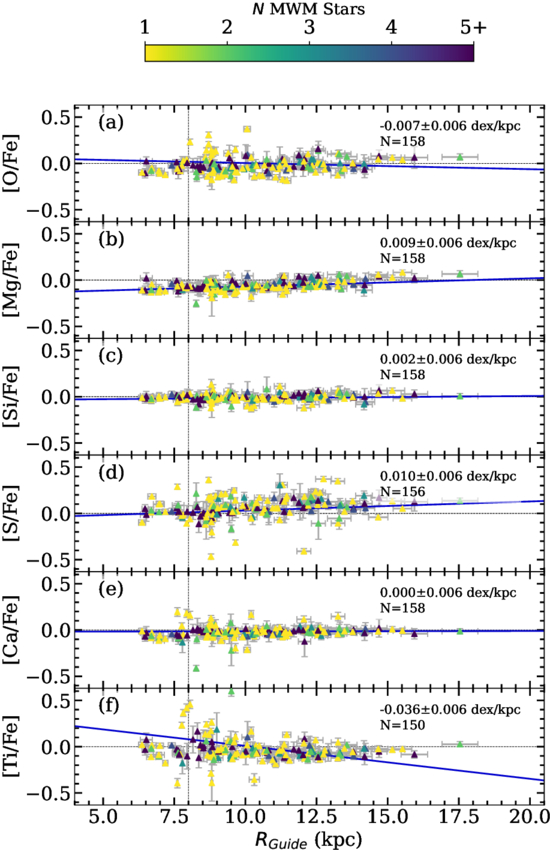The [X/Fe] vs. RGuide trend for the α-elements (O, Mg, Si, S, Ca, Ti). As in Figure 3, the color bar indicates the number of member stars, saturating at five stars. Clusters with a 1σ scatter higher than 0.2 dex for a specific element were not used to determine the fit (solid blue line) and are not plotted. The derived gradient and number of clusters (N) are shown in each panel.