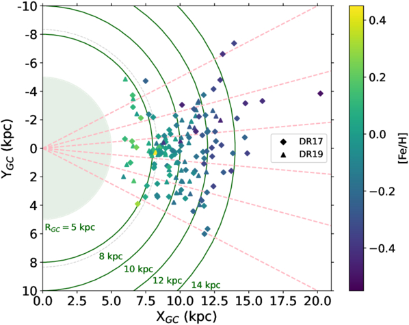 Same plot as Figure 2, where the entire cluster sample is plotted in X–Y space, colored by the mean [Fe/H] abundance. The diamond points denote clusters that were in OCCAM DR17/N. Myers et al. (2022), while triangle points denote clusters new to this DR19 analysis. The solid green lines (RGC = 5, 8, 10, 12, 14 kpc) delineate the annuli used for analyzing azimuthal gradients (see Section 5.3 and Figure 10). The pink dashed lines indicate the boundaries of the azimuthal slices used for analyzing radial gradients (see Section 5.3 and Figure 9). The gray dashed line shows the solar Galactocentric radius used in this work (R⊙ = 8.34 kpc).