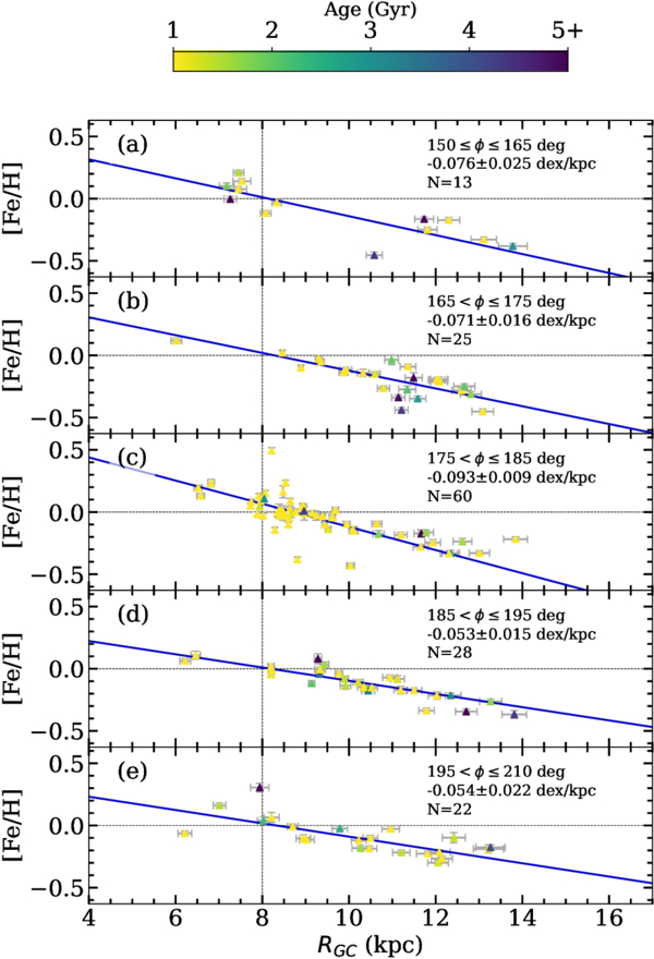 Metallicity gradients ([Fe/H]) as a function of the Galactocentric radius (RGC) for five slices in azimuth angle (ϕ): (a) 150° ≤ ϕ ≤ 165°, (b) 165° < ϕ ≤ 175°, (c) 175° < ϕ ≤ 185°, (d) 185° < ϕ ≤ 195°, and (e) 195° < ϕ ≤ 210°. Points are colored by the cluster age in Gyr, saturating at younger than 1 Gyr and older than 5 Gyr. The linear fits (blue lines), derived gradients, and number of clusters (N) used are shown in each panel. Fits were determined using only the clusters with 5 kpc ≤ RGC ≤ 14 kpc. The regions corresponding to these azimuth slices are shown on an X–Y plot in Figure 8.