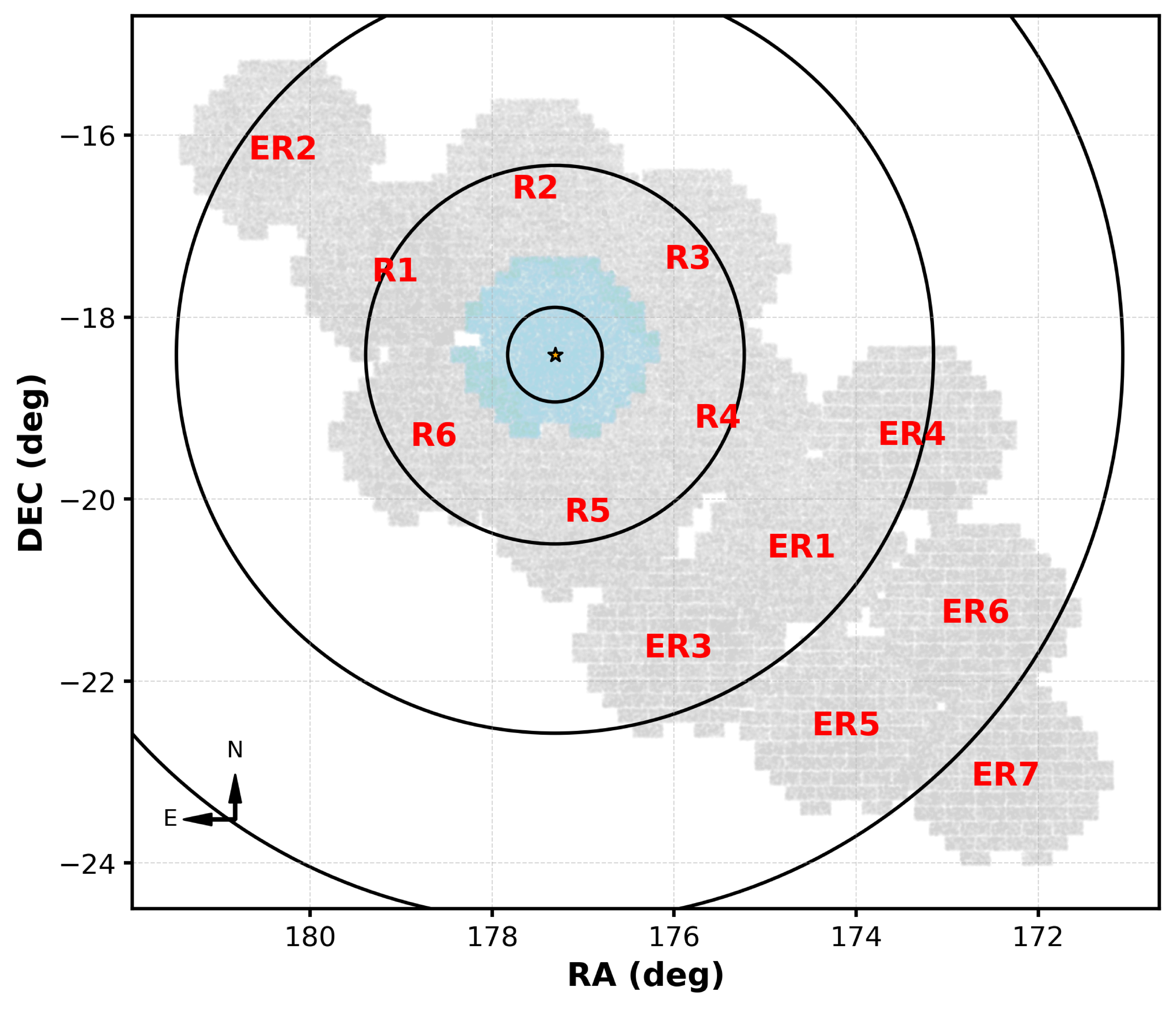 Spatial coverage of our DECam observations of CraII in equatorial coordinates. The gray background, which shows the footprint of our survey, is a density map made with all stars in our catalog. The central region, in blue, shows the single field observed in V20. Black ellipses indicate 1rh, 4rh, 8rh, and 12rh. The orange star marks the center of CraII.