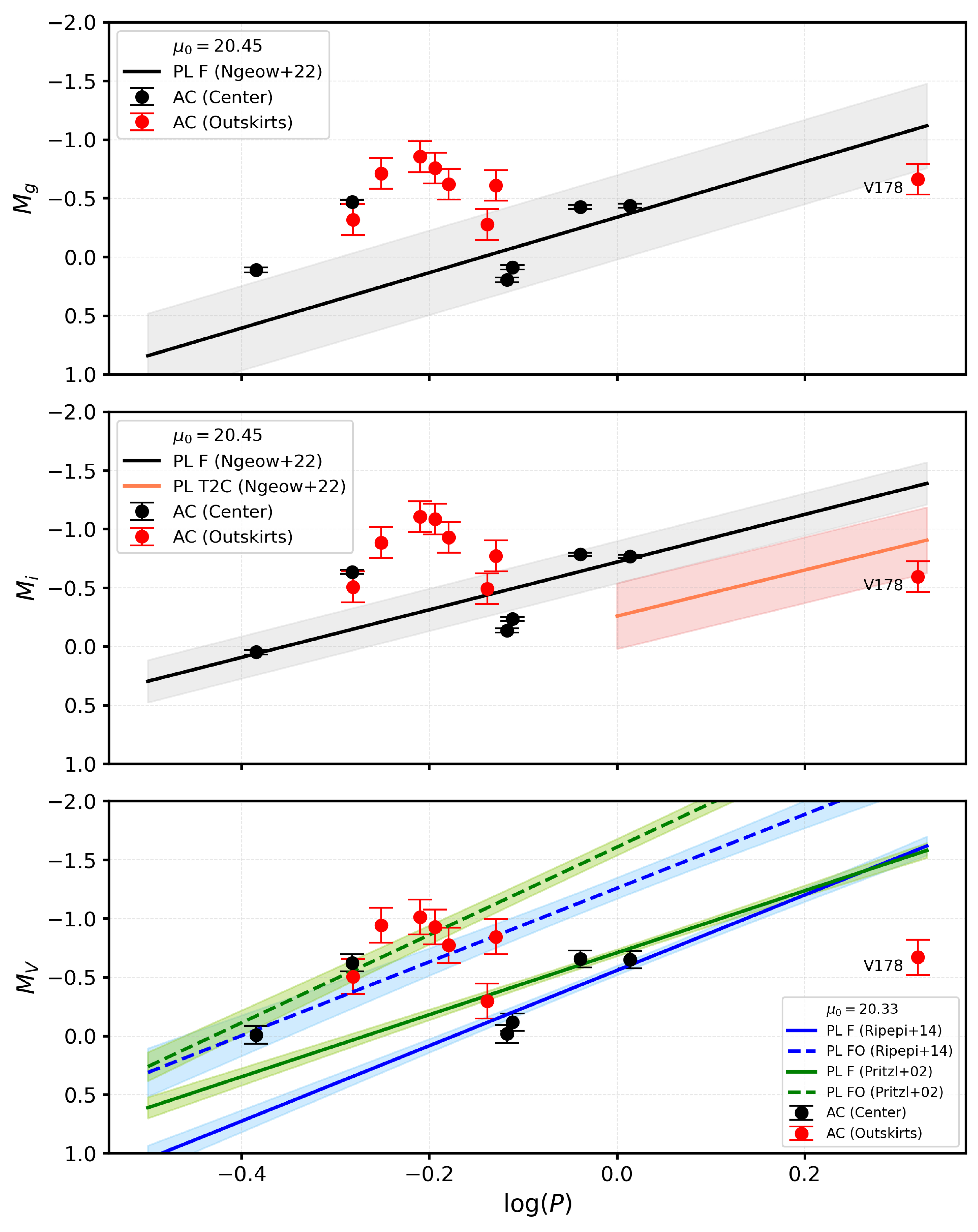 Absolute magnitude vs. period for the AC stars in the central field of CraII (black circles; from V20) and in the tails (red circles) in three different bands, g (top), i (middle), and V (bottom). For g and i we overlay the PL relationships for F-mode AC stars from C.-C. Ngeow et al. (2022b) as black solid lines. In the bottom panel, two different PL relationships in the V band for fundamental (solid lines) and first-overtone (dashed lines) AC stars are shown (B. J. Pritzl et al. 2002; V. Ripepi et al. 2014).
