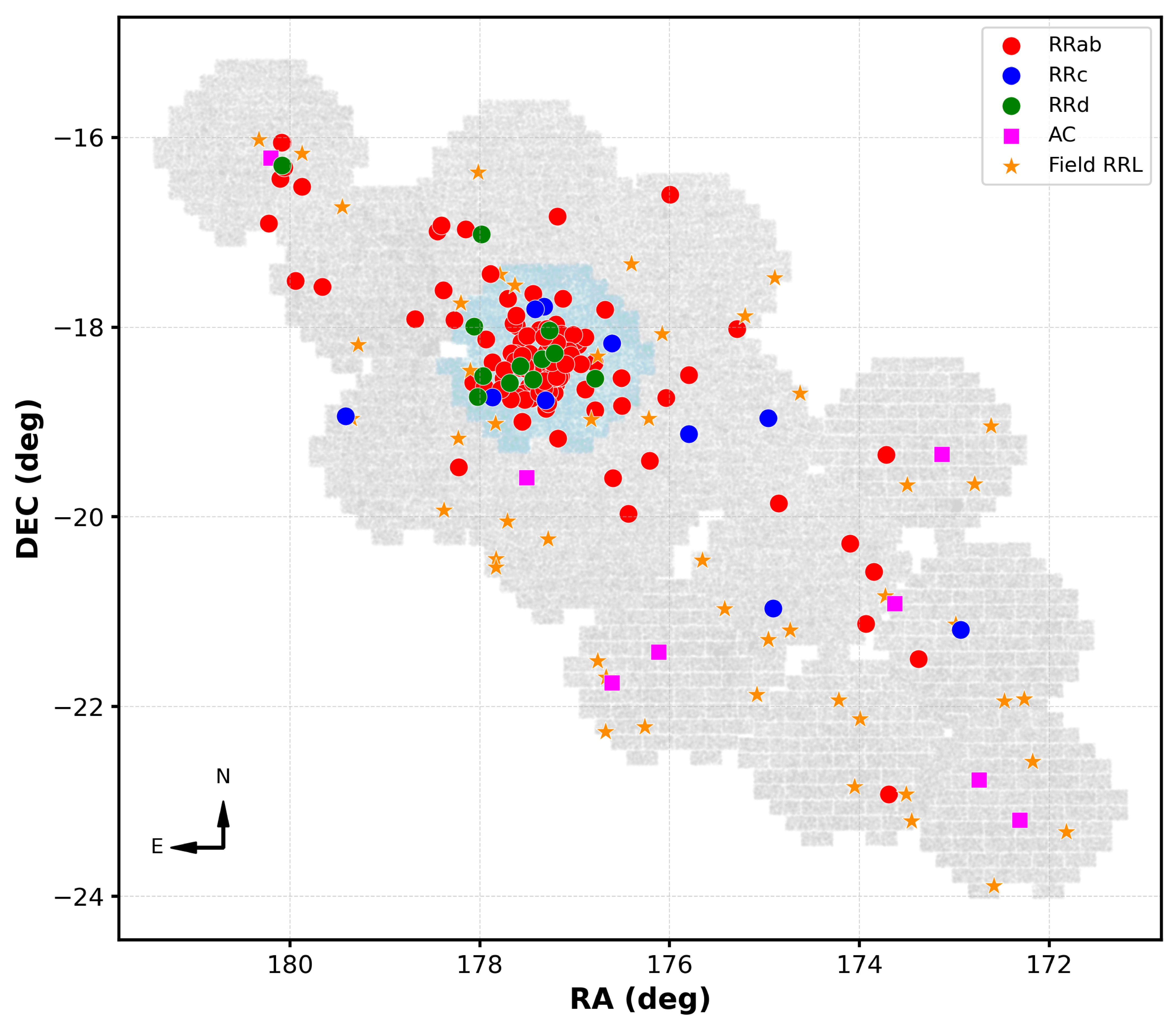 Equatorial coordinates of the different types of RRLSs and AC stars in CraII (V20) and its outskirts (this work). Symbols are the same as in the CMDs of Figure 4. The gray background is a density map made with all stars in our catalog of outskirts fields. Stars over the blue background are those reported in V20 for the central field.