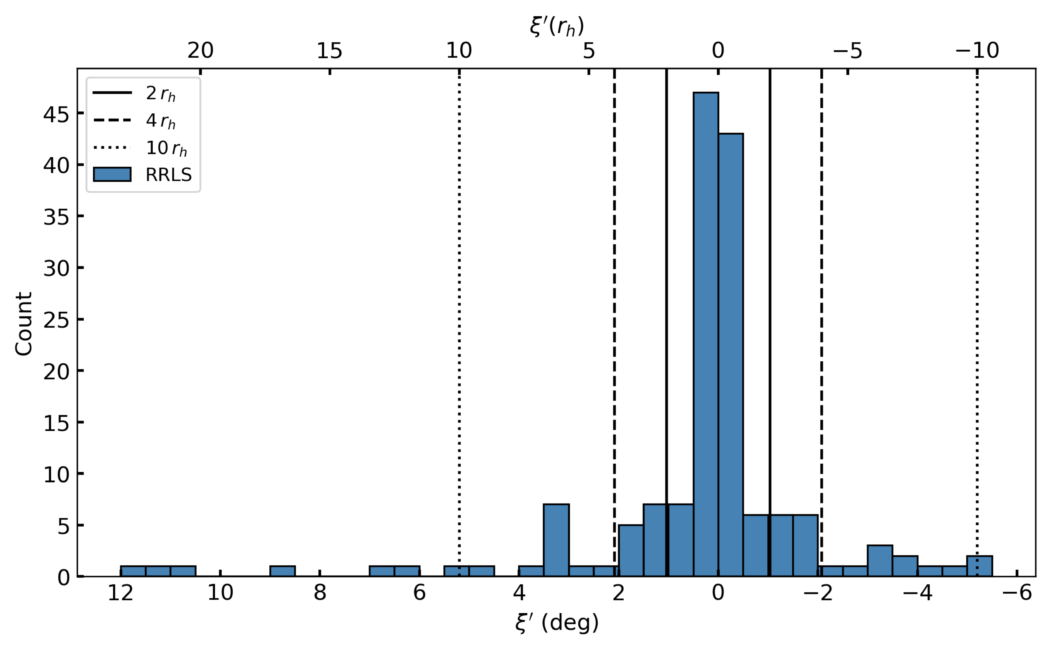 Number of RRLSs in CraII along the axis of the tails, in bins of ﹩0\mathop{.}\limits^{^\circ }5﹩. The sample of RRLSs includes those from V20, P. S. Coppi et al. (2024), and this work. For convenience ﹩{\xi }^{{\prime} }﹩ is shown in units of degrees (bottom axis) and in units of rh (top axis).