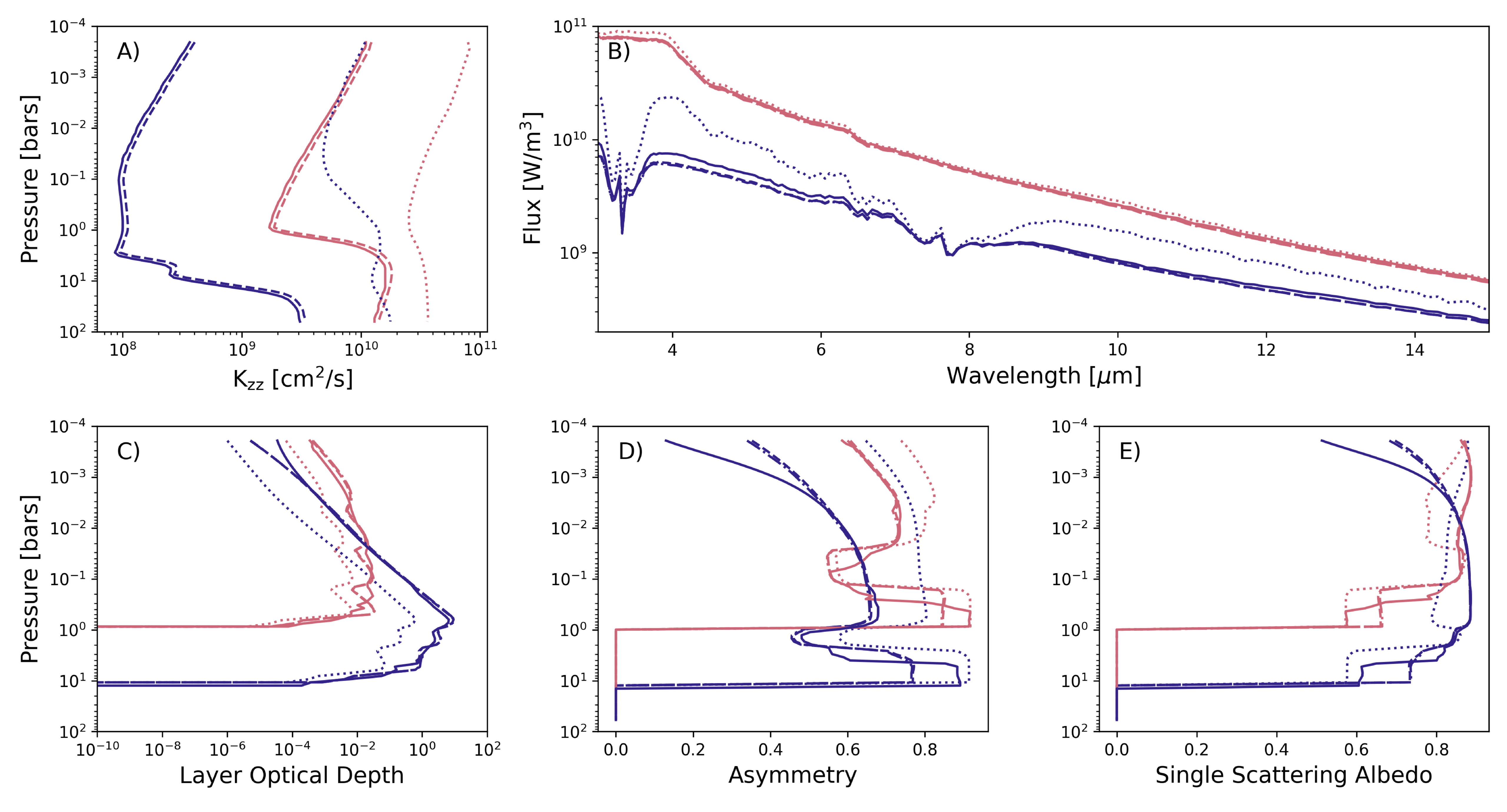 Here we demonstrate Virga’s ability to reproduce the Diamondback model grid’s cloud models, given the precomputed pressure–temperature profile. In panels (a)–(e), solid lines are data derived straight from Zenodo or Diamondback log files. In panel (a) we start by demonstrating the ability to reproduce the K zz profile used for Diamondback using the Virga function to compute K zz. Dashed lines show the profile derived from a convective heat flux profile taken from EGP, while dotted lines show the profile computed using an estimate for the convective heat flux (dotted line). Panels (c)–(e) show the Virga output using the corresponding K zz profiles from panel (a). Note that dotted–dashed lines show the optical properties derived when directly using the K zz profile from Diamondback (solid line K zz in panel (a)). Panel (b) shows all corresponding spectra alongside those published. Ultimately we can reproduce the Diamondback spectra when using self-consistent estimates for the convective heat flux.