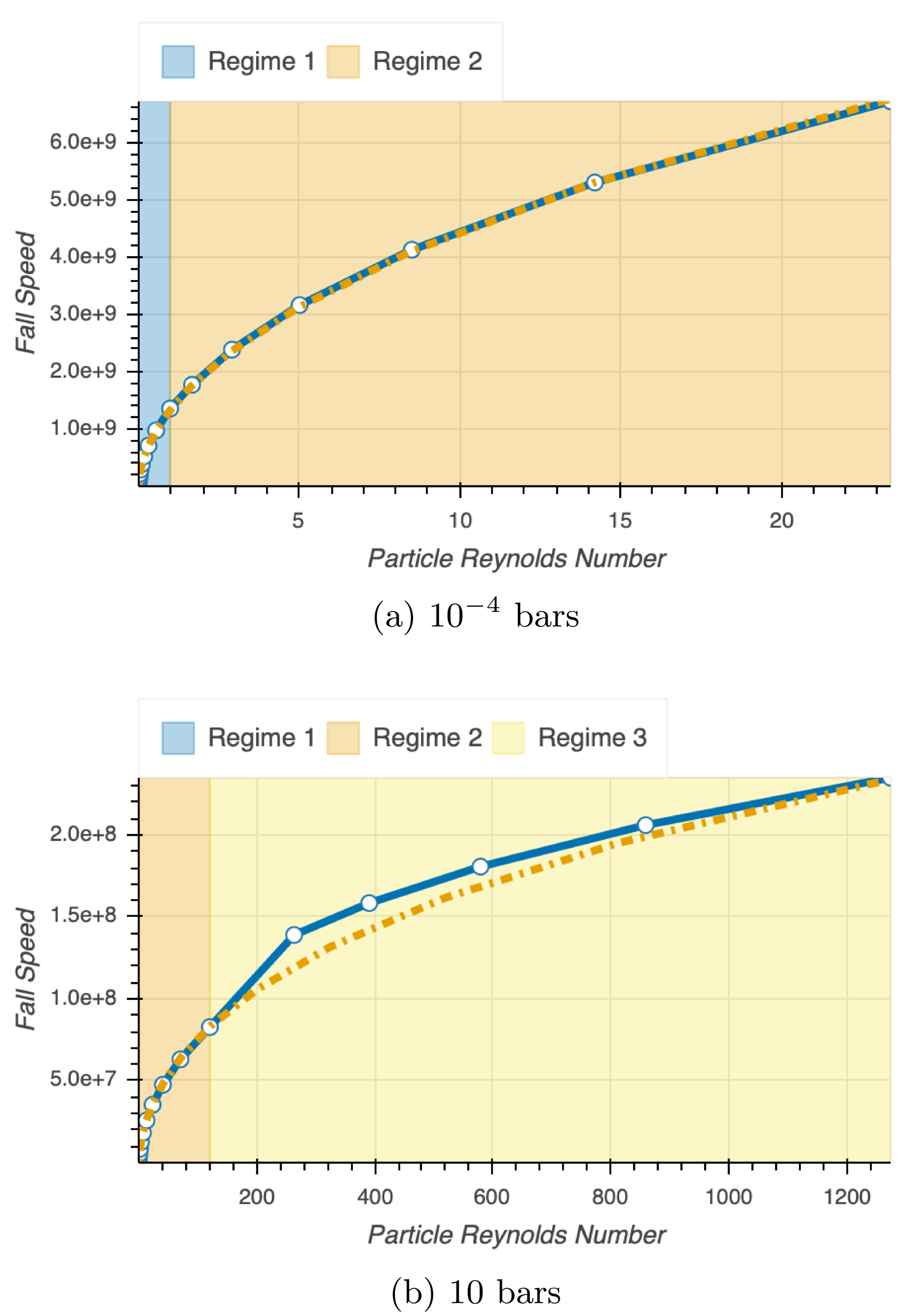 Fall speed for Cr particles at different pressures obtained using the original regime-based calculation of virga (solid blue line) and the KR model (dashed orange line).