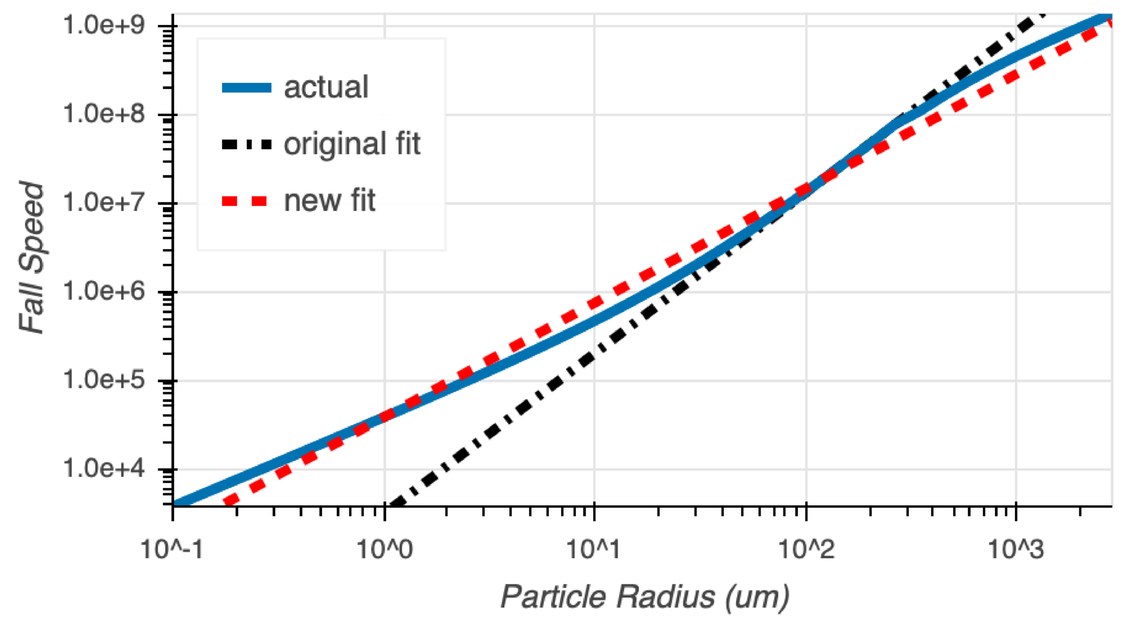 Power-law approximation to fall speed v f of Cr particles at 10−2 bars. The new approximation (red dashed line) is a better fit to the actual fall speed (blue solid line) than the original calculation (black dashed–dotted line).