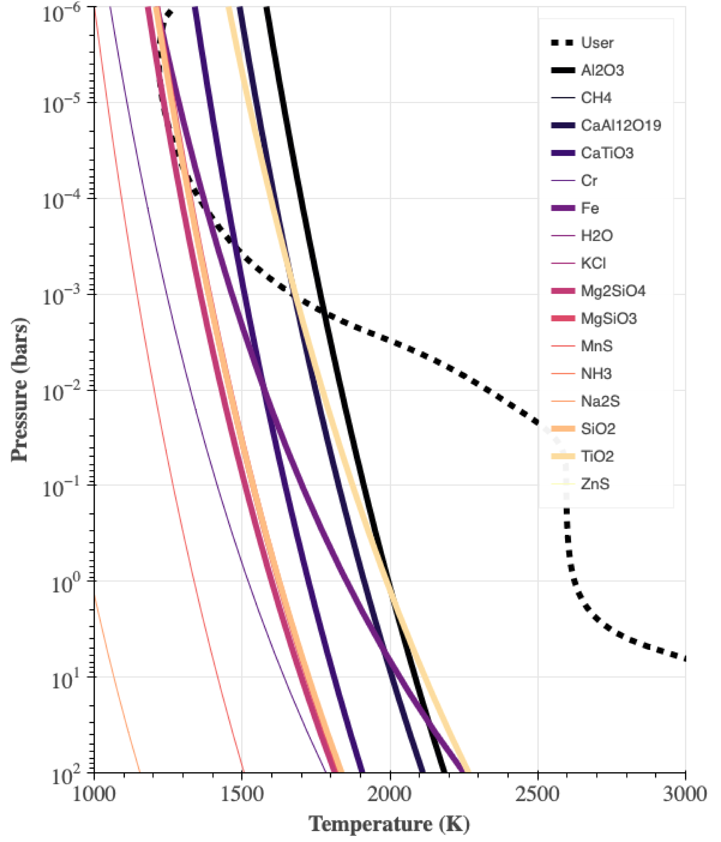 Default plot from Virga’s recommend gas function shown for the pressure–temperature profile published in D. Grant et al. (2023). The dashed curve represents the user-input P–T profile, while solid lines represent the condensation curves. The thick solid curves are mathematically what gases Virga would condense. We urge users to carefully consider what condensate to include in their model instead of choosing all those that mathematically condense.