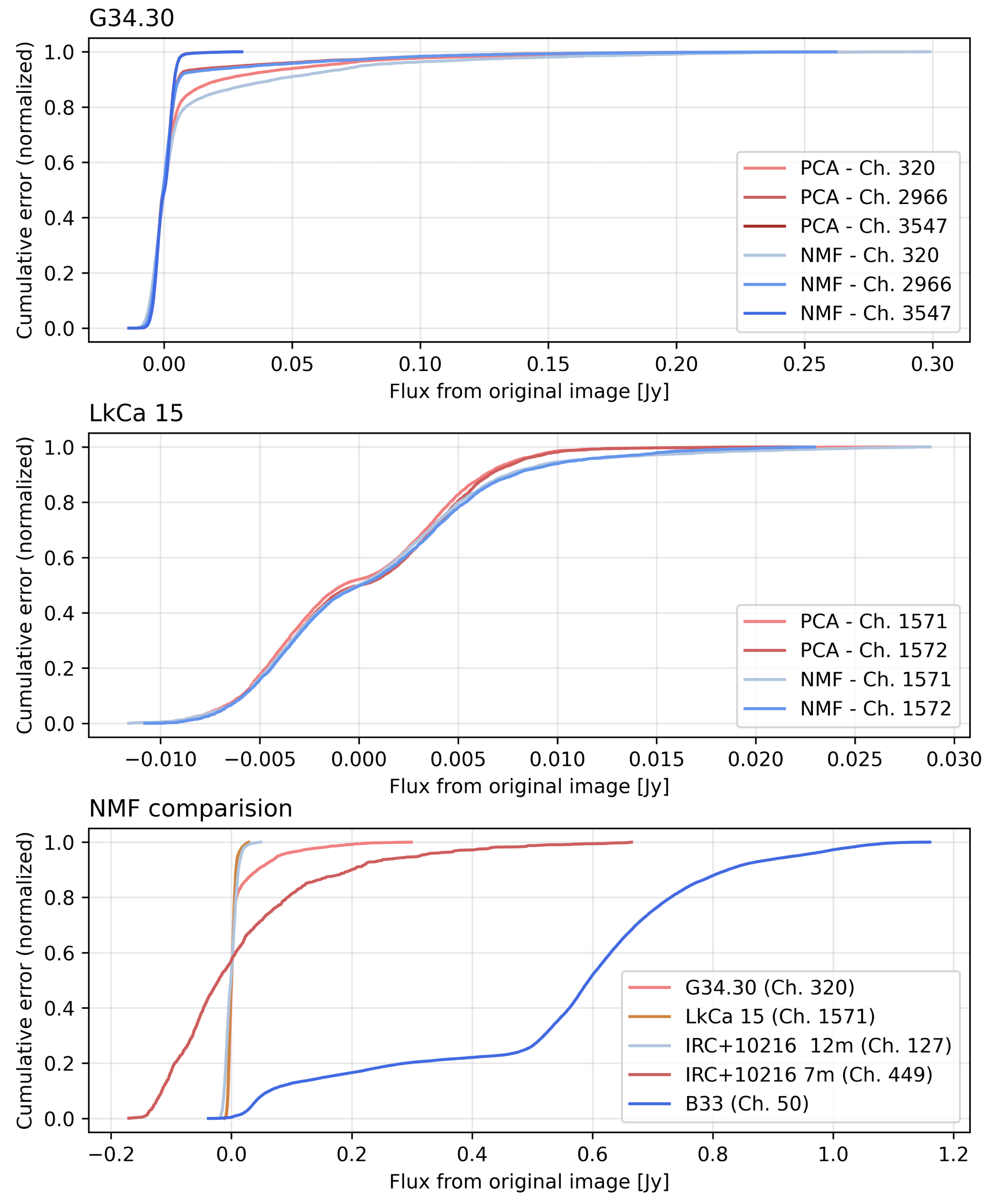 Cumulative error in image reconstructions with respect to the pixel flux of the original channel maps. The top and middle panels correspond to the errors in the G34.30 and LkCa 15 reconstructions using PCA and NMF (Figures 4 and 5). The bottom panel shows the cumulative error from the select channels of each sampled source in Figure 6 using NMF.