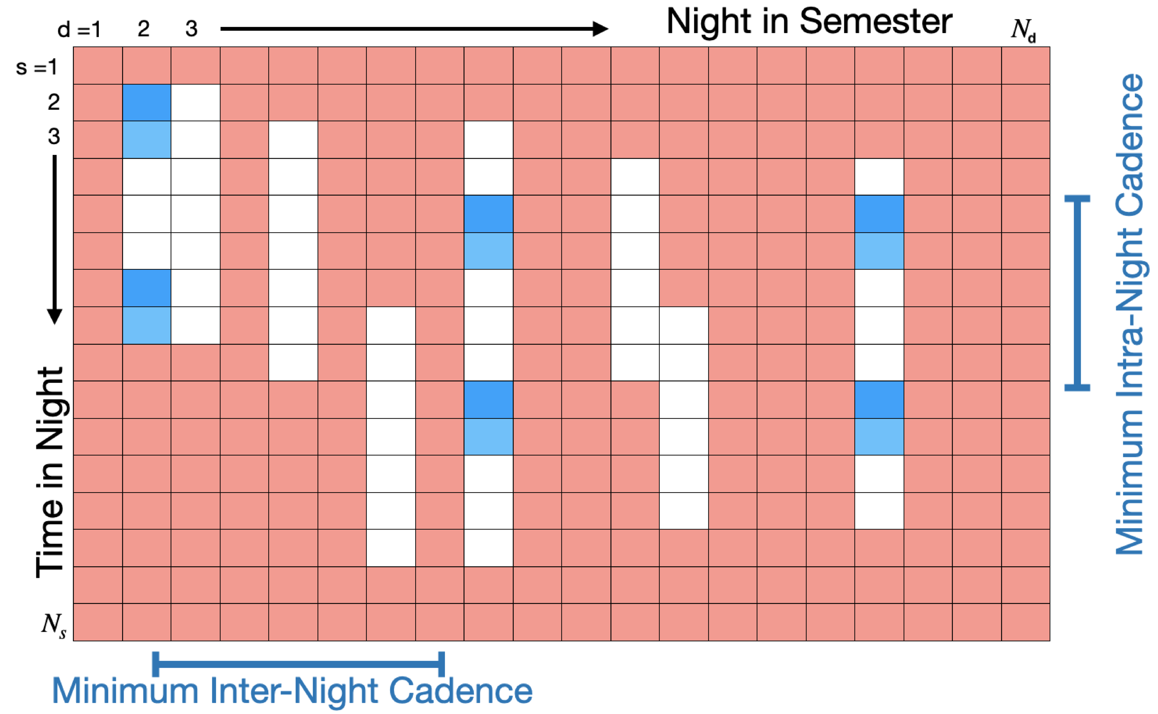 Day-slot scheduling framework. AstroQ discretizes time in an observing semester into Nd × Ns slots of equal length, where d and s label each day and slot, respectively. Each request is accessible for a subset of all possible (d, s) pairs, and the inaccessible slots are red. The binary decision variable Yr,d,s is 1 if a visit of request r begins in slot s on day d (shown as dark-blue squares) and 0 otherwise. Here the request specifies tvisit,r = 2 slots to complete a visit. The light-blue cells indicate the (d, s) pairs where no other observations may commence. The request specifies a minimum internight cadence τinter,r of 6 days, i.e., the minimum number of days between successive visits. It also species a minimum intranight cadence τintra,r of three slots.