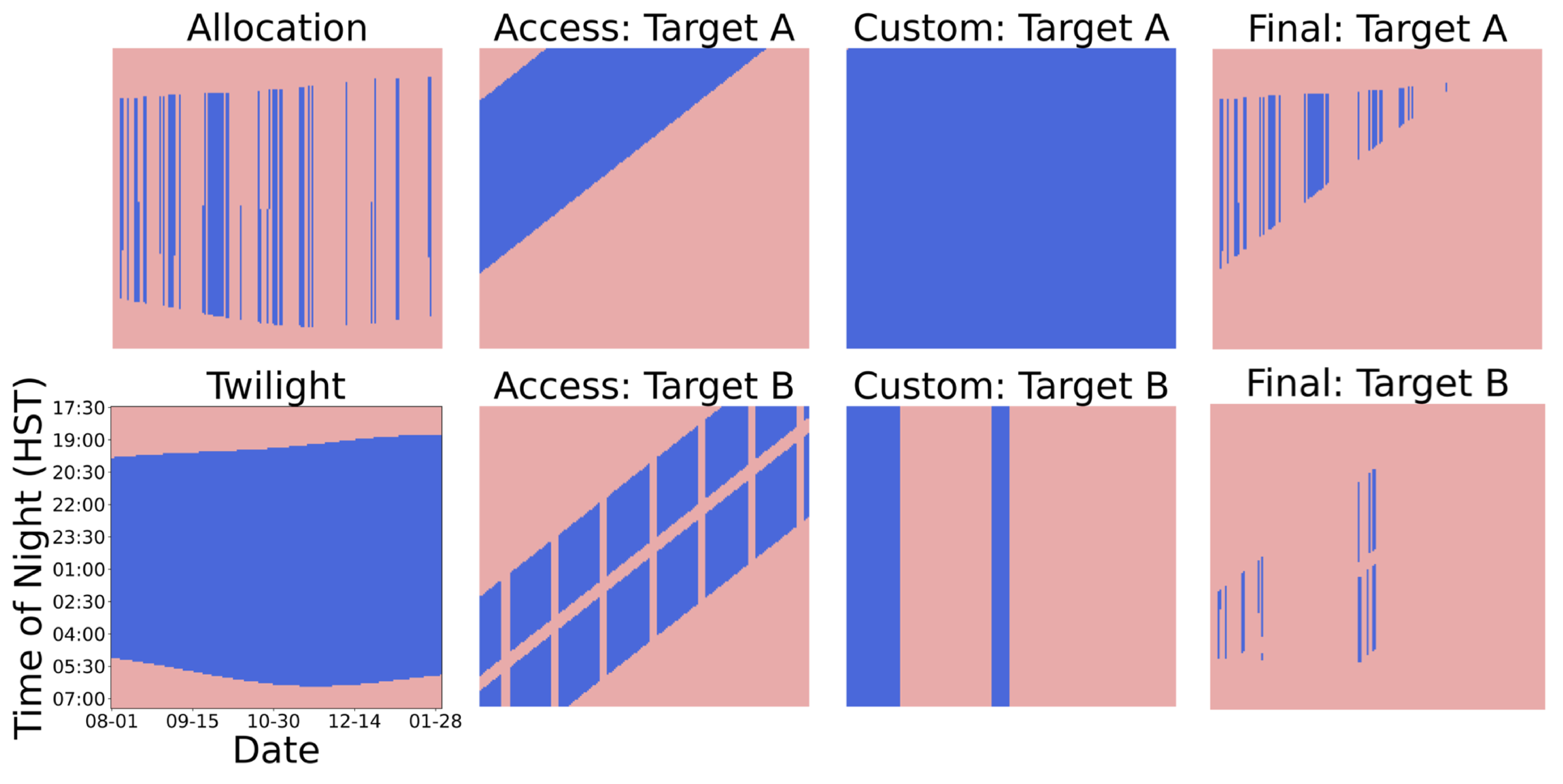 Construction of two accessibility maps. Each panel is analogous to Figure 1 and shares the same limits. The left column shows the allocation and twilight maps drawn from the Keck 2018B semester (see Section 4.2), which are the same for both requests. The two requests have different coordinates and thus different accessibility maps. For Target A, the upward tilt of the blue band indicates progressively later rise/set times over a semester. For Target B, the vertical stripes are due to Moon “collisions” and the diagonal exclusion region is due to zenith crossing events. Target A has no custom accessibility constraints, while Target B is restricted to a range of dates. The right column shows the final maps Ar, which are the intersection of all constituent maps. Each request’s final accessibility set ﹩{{ \mathcal A }}_{r}﹩ consists of the blue (d, s) pairs.