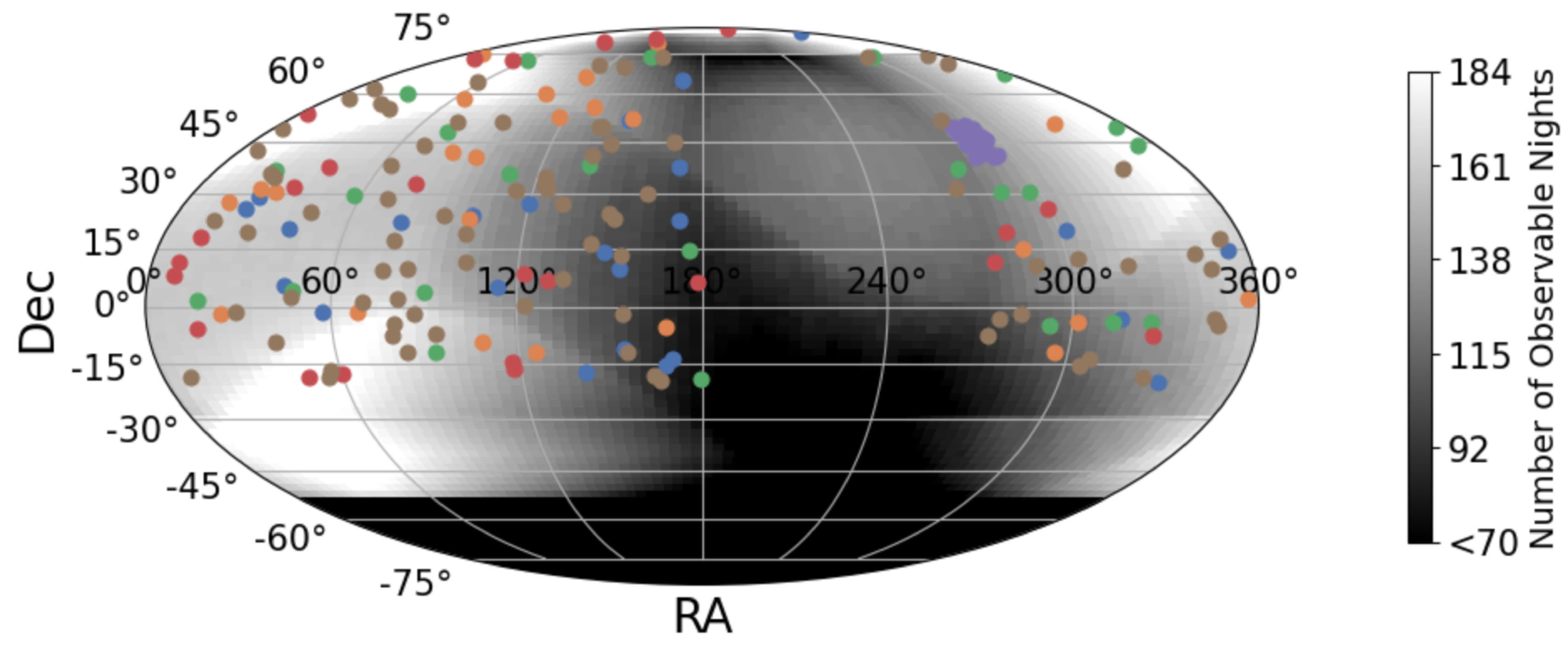 Distribution of sky coordinates from the nominal request set described in Section 4.1. Marker colors are the same as in Figure 5. The shading shows the number of unique B semester nights a target is observable as a function of R.A. and decl. The dark cap below decl. −50° consists of southern targets that never clear the minimum elevation requirements, the dark region near the north celestial pole circumpolar stars is often obstructed by the Keck I Nasymth platform, the wave-shaped band is due to the Moon, and the dark vertical band at ∼240° corresponds to R.A.s that are antialigned with the B semester.