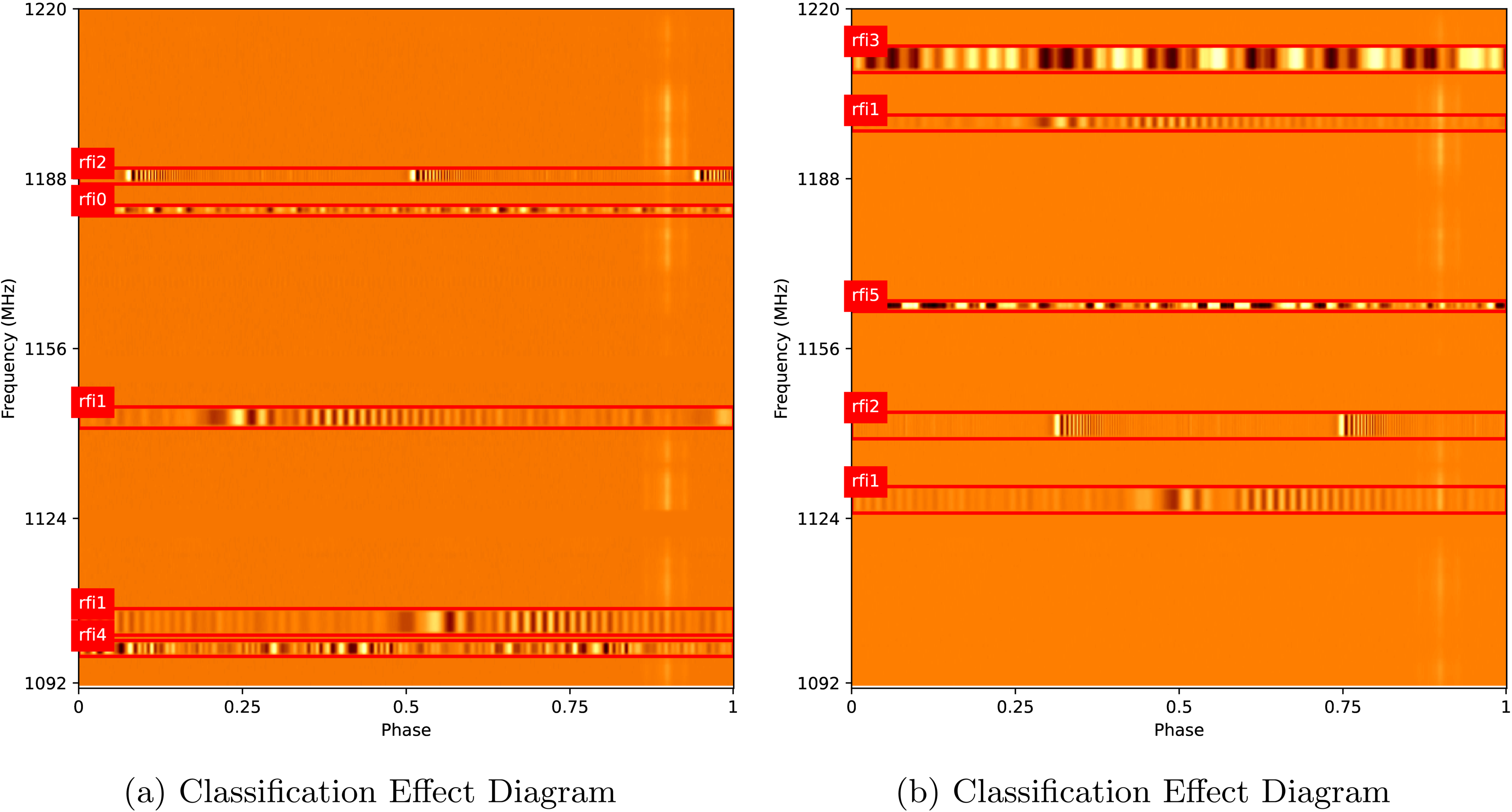 Classification effect diagram. This shows the validation effect of the model on the validation dataset. The horizontal coordinate is the phase, and the vertical coordinate is the frequency. A variety of RFI data in different frequency ranges are trained by the RFI-MN classification model. In order to fully verify the robustness of RFI-MN, the validation set is used to verify the model. The RFI is detected, classified, and extracted by the model, and the prediction frame can be generated and output in the corresponding frequency range, showing high accuracy for subsequent scientific research.