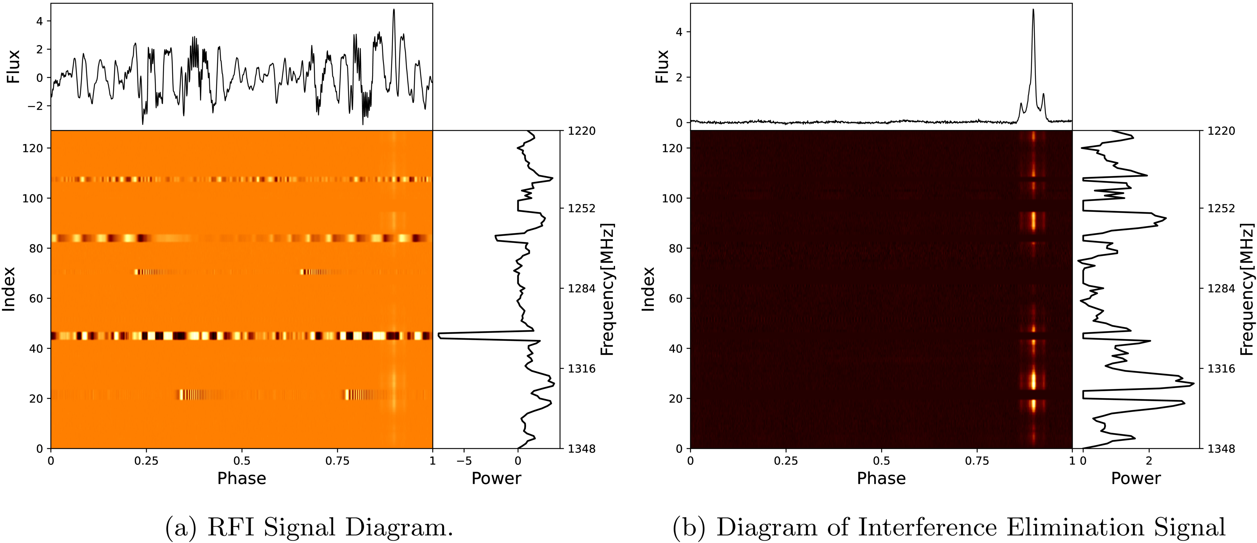 Comparison chart before and after interference elimination. Panel (a) shows the ultra-wideband pulsar data affected by a variety of RFIs. There are a variety of RFIs in different channel ranges, so that the true pulsar signal is masked. It is the input data of the RFI-MN structure. Panel (b) presents the RFI-labeled and classified data after interference suppression—the core objective of this study, which aims to mitigate the impact of RFI on astronomical data and provide clean data for subsequent scientific research.