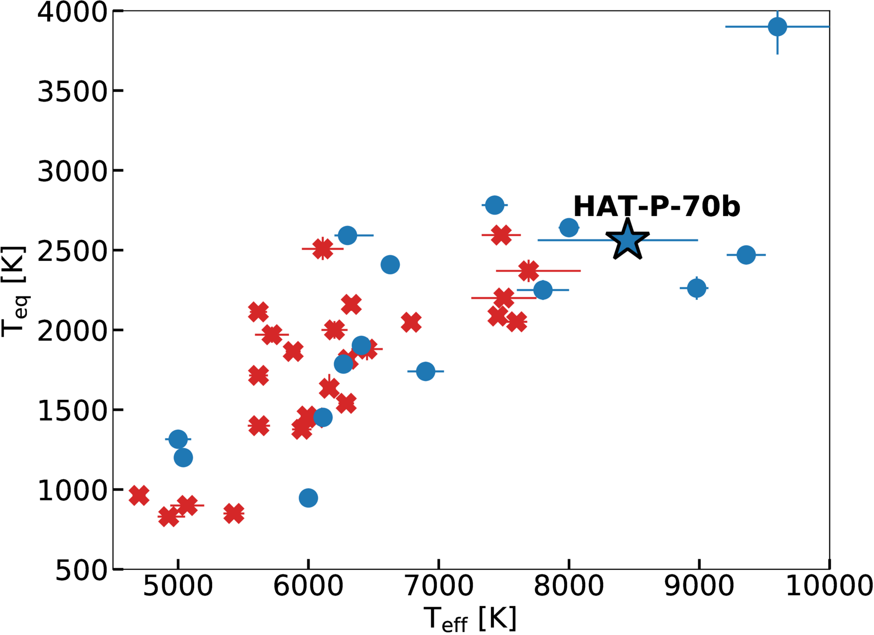 Effective temperature vs. equilibrium temperature for the gas giant population (Rp ≳ 0.5 RJup) with Hα observations. Planets with detection of Hα are marked with blue dots, while those with Hα nondetections/upper limits are marked with red crosses. Results are retrieved from the ExoAtmospheres website.
