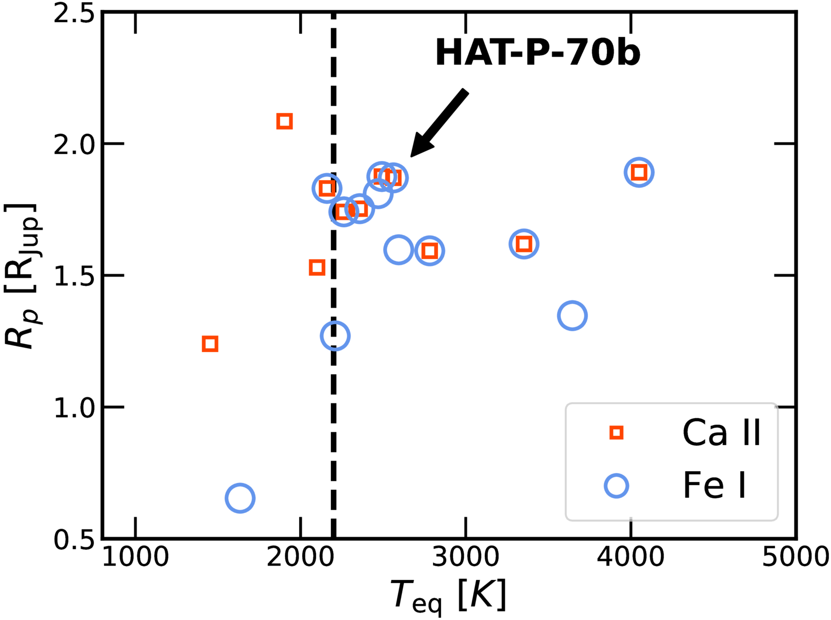 The equilibrium temperature and planet radius distribution of planets with either Fe I (blue circle) or Ca II (red square) detections in their atmospheres. The vertical black dashed line represents the lower temperature threshold (2200 K) of UHJs. HAT-P-70b is marked by a black arrow.