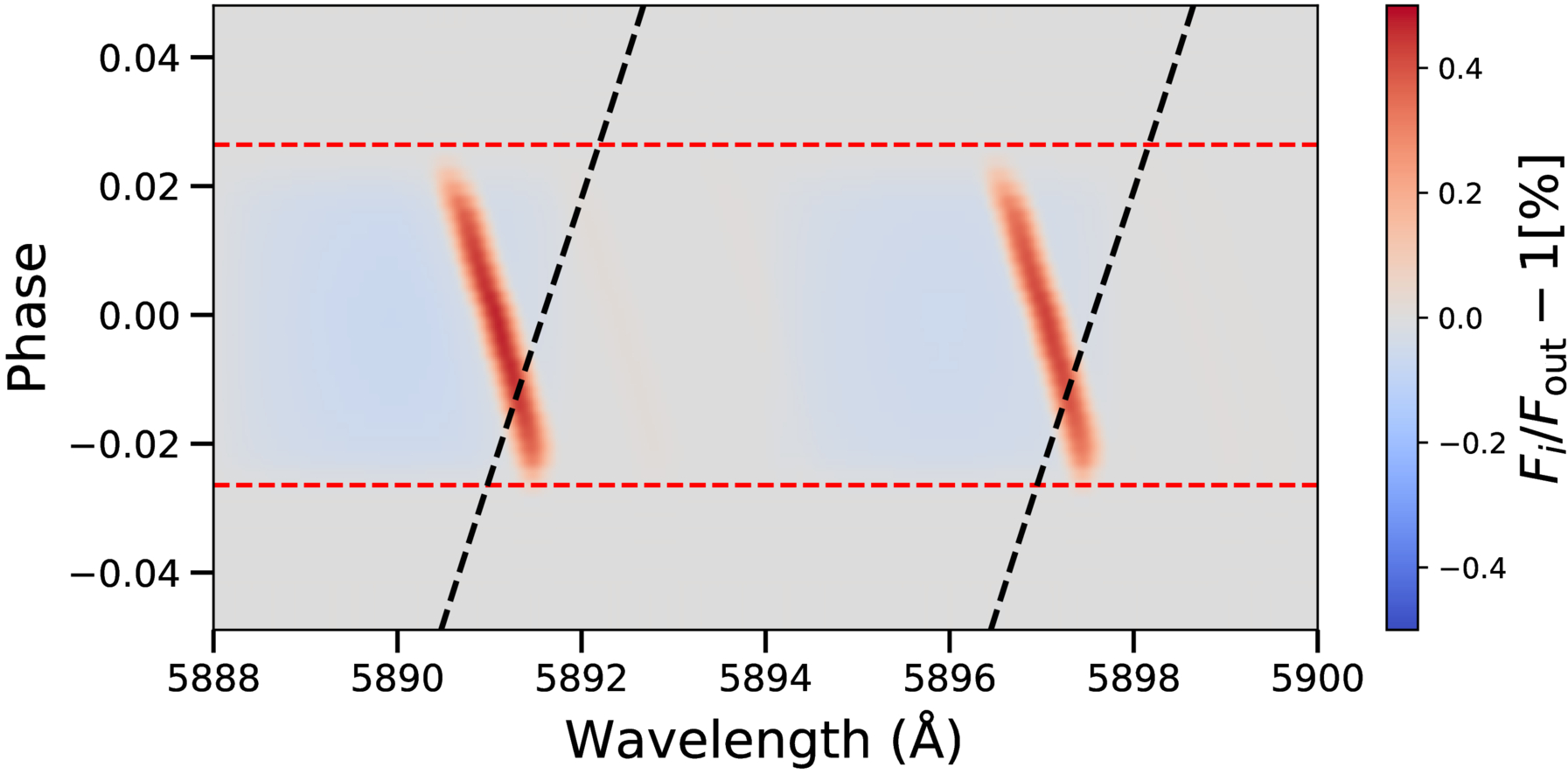 The model of the RM and CLV (see Section 3.2) around the Na I doublet, normalized by the out-of-transit model spectrum, in the stellar rest frame. The horizontal red dashed lines mark the first and fourth contacts of the transit event. The black tilted dashed line represents the trace of the planetary orbital motion.