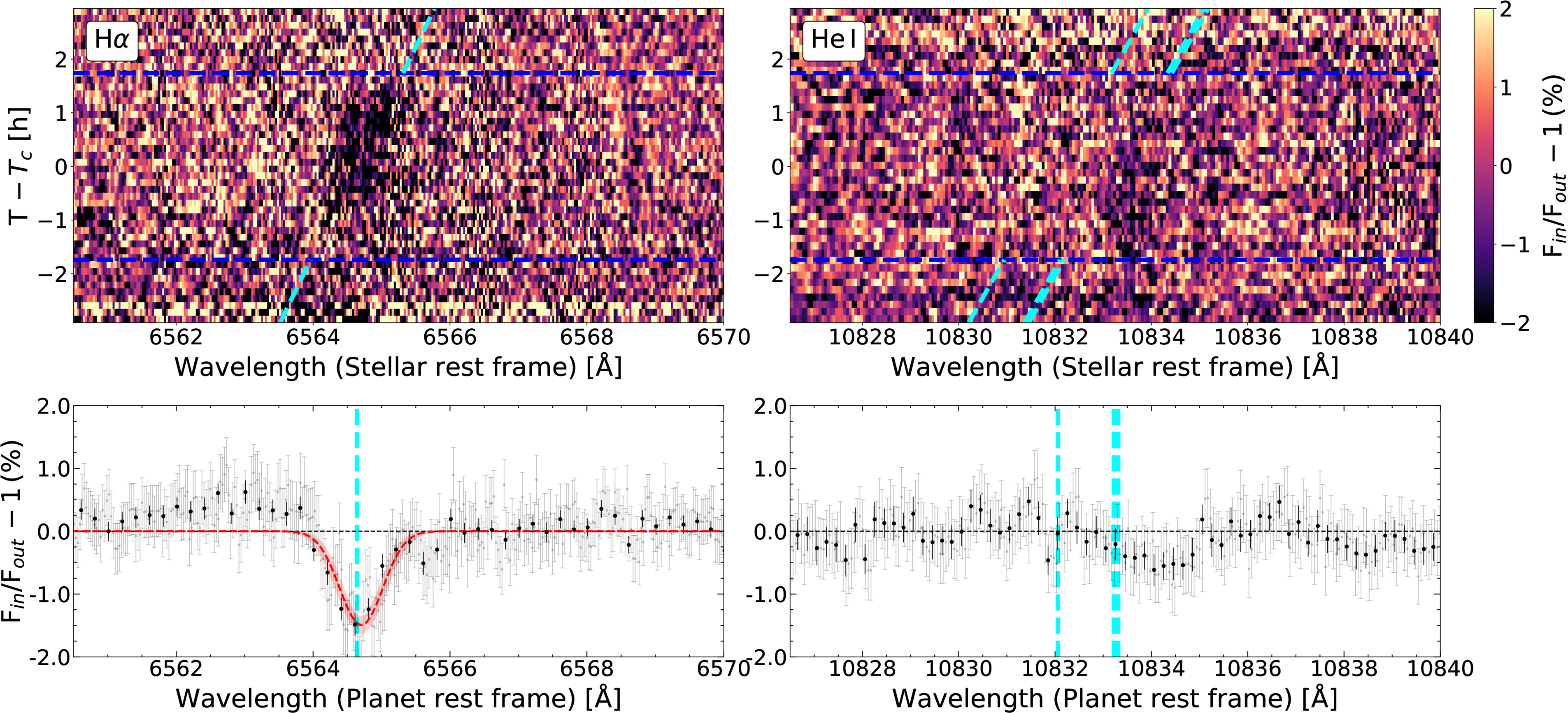 Residual maps and transmission spectra around Hα (left) and the He I NIR triplet (right) lines. Top panels: residual maps in the stellar rest frame. The time since midtransit time (Tc) is shown on the vertical axis, wavelength is on the horizontal axis, and relative absorption is color coded. Dashed blue horizontal lines indicate the transit duration. Dashed cyan tilted lines show the theoretical trace of the planetary signals. Bottom panels: transmission spectra obtained by combining all the spectra between the first and fourth contacts. We show the original data in light gray and the data binned by 0.2 Å in black. The best-Gaussian-fit model is shown in red along with its 1σ uncertainties (shaded red region). Dashed cyan vertical lines indicate the Hα (left) and the He I triplet (right) lines' positions. All wavelengths in this figure are given in vacuum.