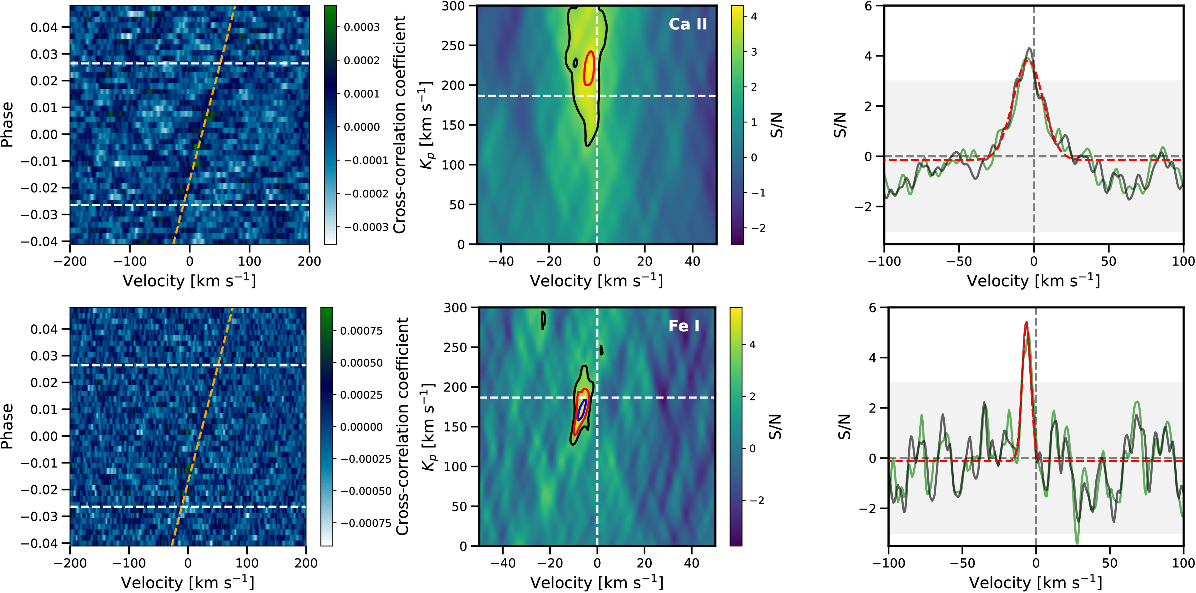Cross-correlation results of HAT-P-70b with robust detections that have S/N ≥ 4 (top: Ca II, bottom: Fe I). Left panel: cross-correlation residual map. The horizontal white dashed lines mark the first and fourth contacts of the transit event. The orange tilted dashed line represents the planet's trajectory. Middle panel: The cross-correlation S/N as a function of the velocity shift (Δv) and planet Keplerian velocity (Kp). The vertical and horizontal white dashed lines show the expected location of the planet signal (0 km s−1 and 187 km s−1). The black, red, and blue contour lines mark the region with S/N equal to 3, 4, and 5. Right panel: The 1D cross-correlation function at the best Kp (black) along with the best-fit Gaussian profile (red). The green line is the same result, but based on the Kp in the literature (see Section 3.3.3 for details). The gray shaded region highlights the cross-correlation S/N between −3 and 3.