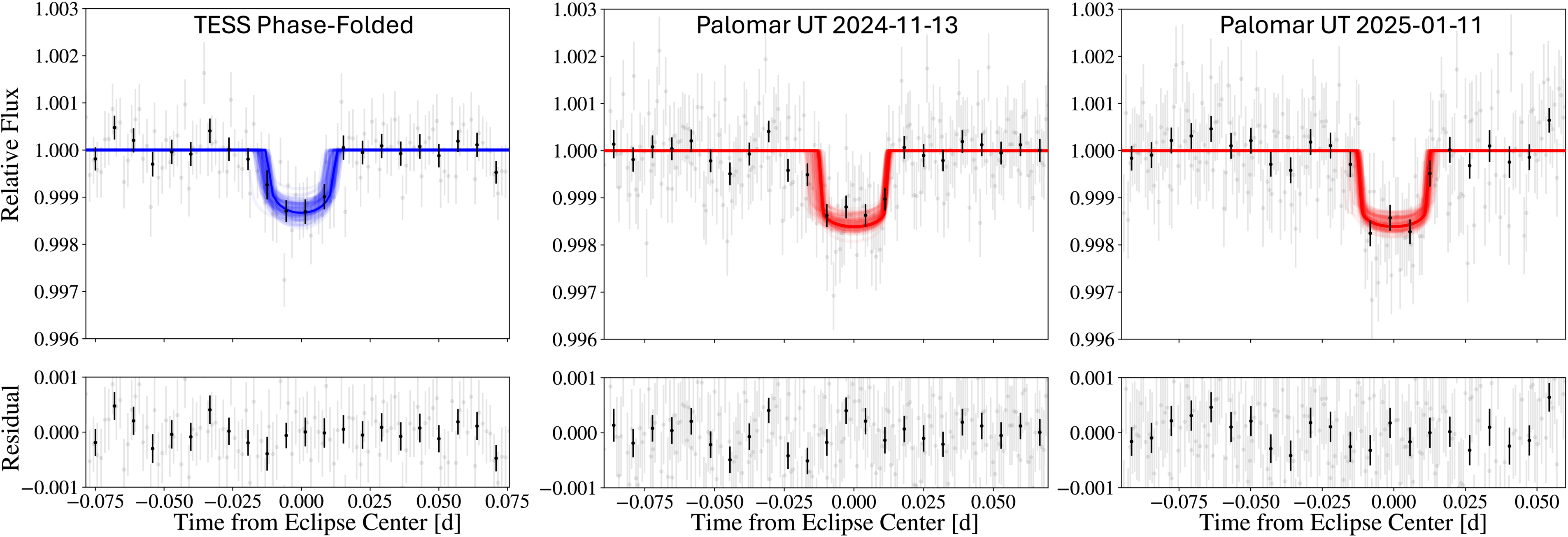 Phased-folded and 2 minute binned TESS light curve (left panel) and detrended Palomar/WIRC light curves (middle and right panels) for the two transit observations of TOI-2267 d. Residuals after the best-fit transit light curve model has been subtracted are shown in the lower panels. Unbinned data are shown as gray circles, with 10 minute binned points overplotted as black circles. The best joint-fit transit models are overplotted as blue lines for the TESS data, and red lines for the Palomar data, with 100 random draws from the posterior distribution to illustrate the typical model uncertainty. All detrended light curves are available electronically as data behind the figure.
